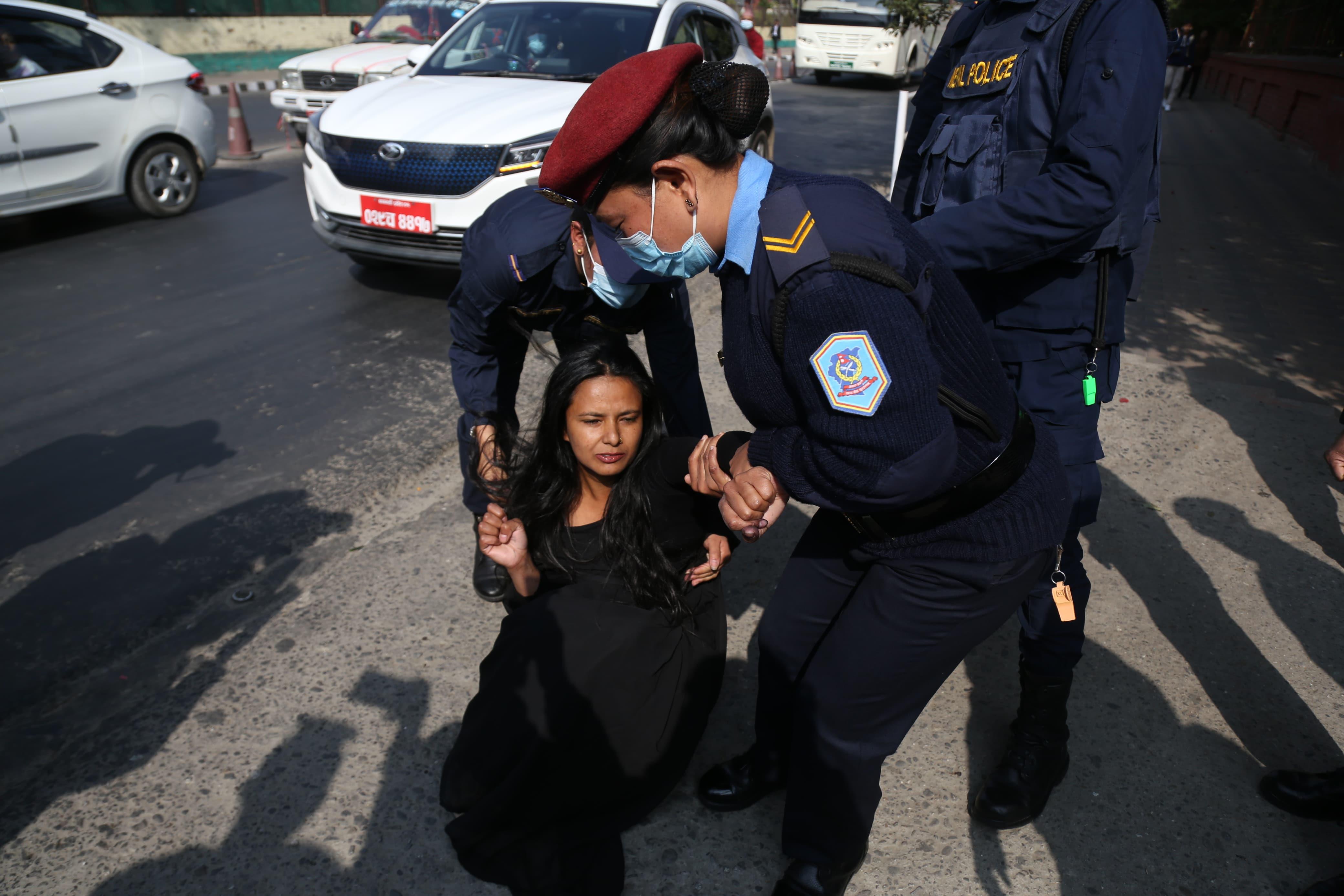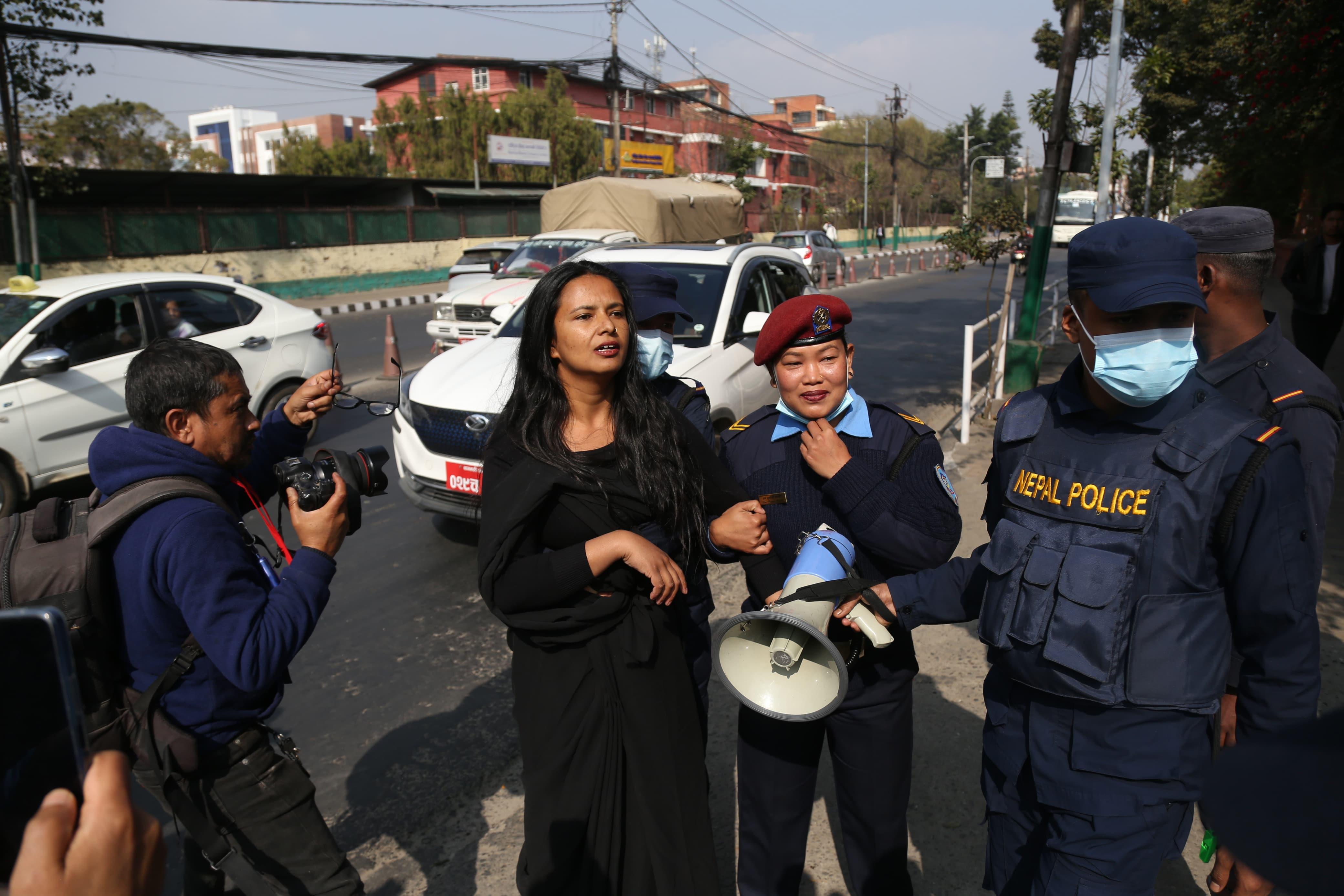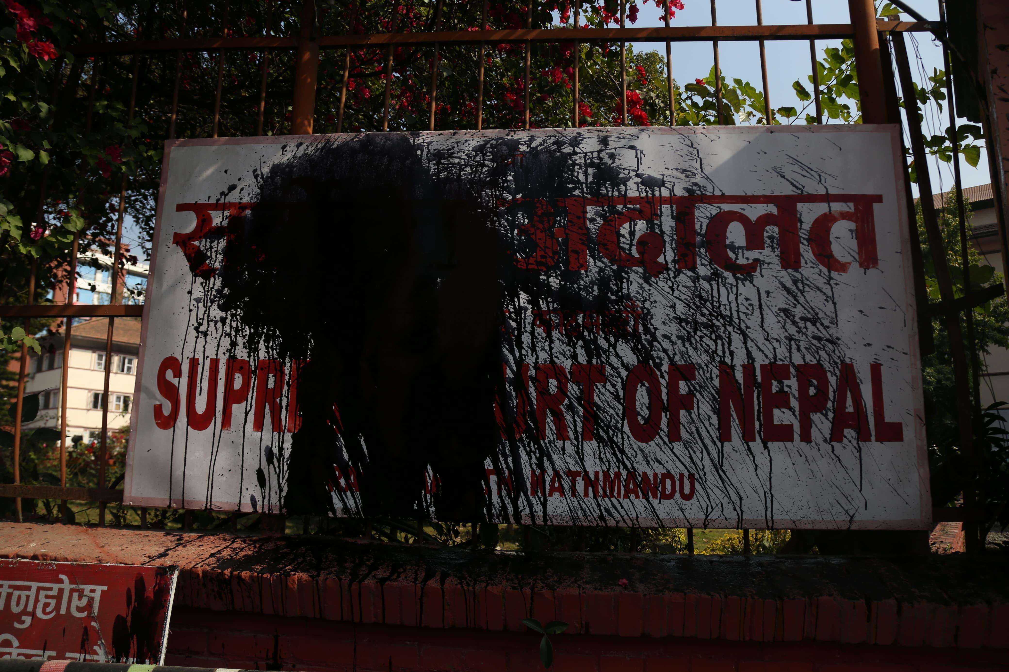 सर्वोच्च अदालतको बोर्डमा कालो रङ छ्यापेको आरोपमा बिनु यादवलाई प्रहरीले नियन्त्रणमा लिएको छ। आफूलाई घरेलु हिंसापीडित भएको बताउने उनले मंगलबार सर्वोच्चको मूल गेट नजिकको बोर्डमा कालो रङ छ्यापेकी हुन्। तस्वीर: नेपाल फोटो लाइब्रेरी