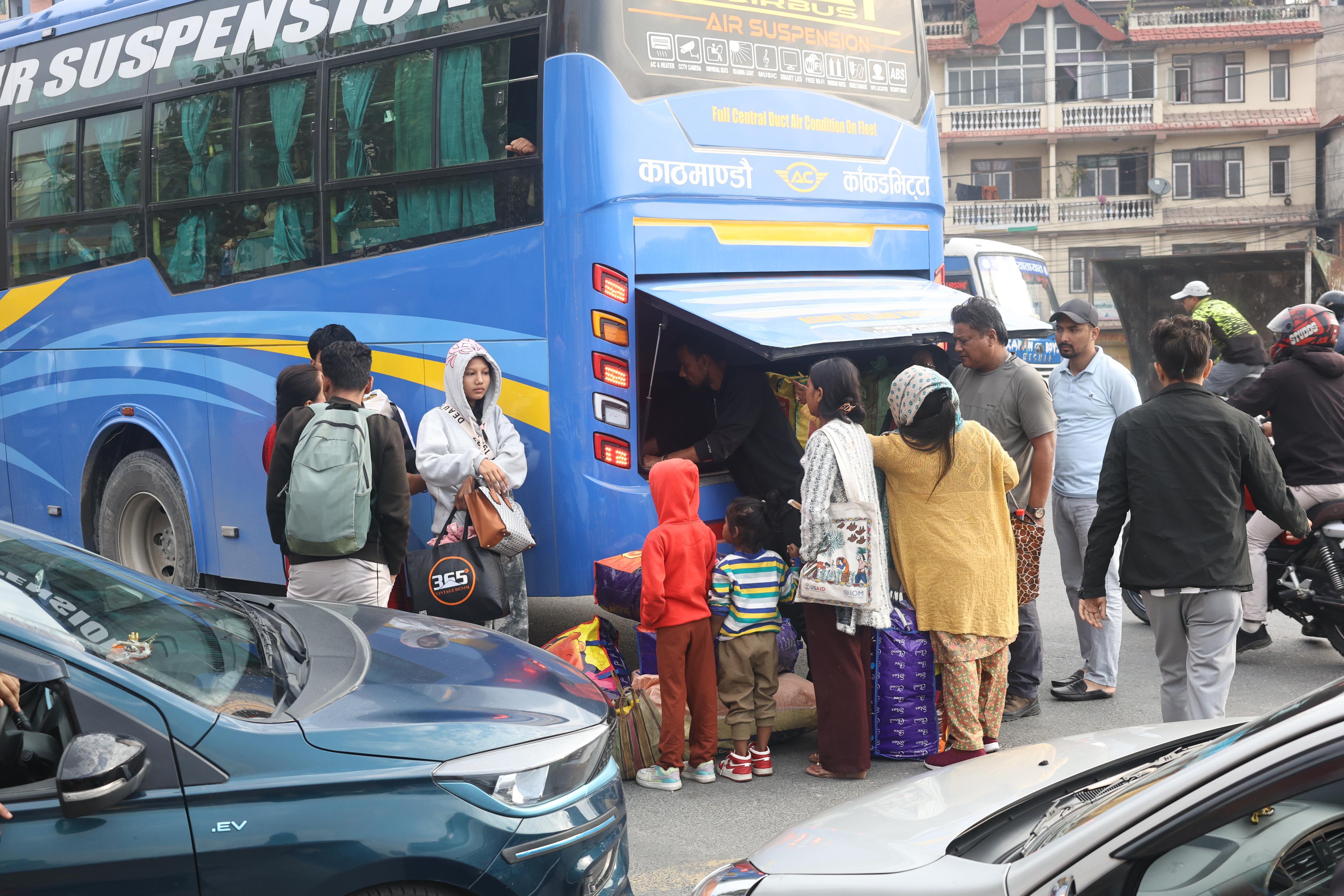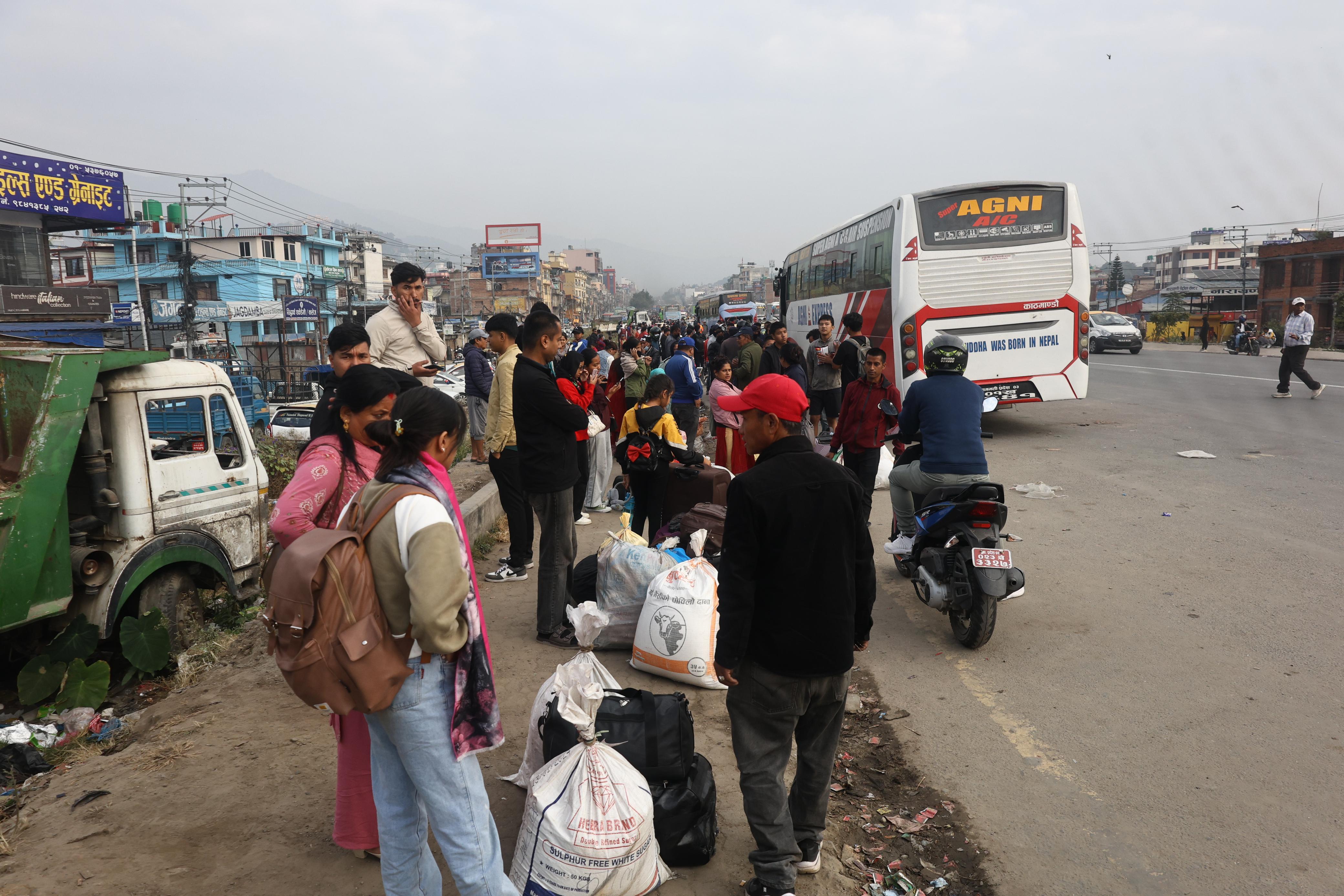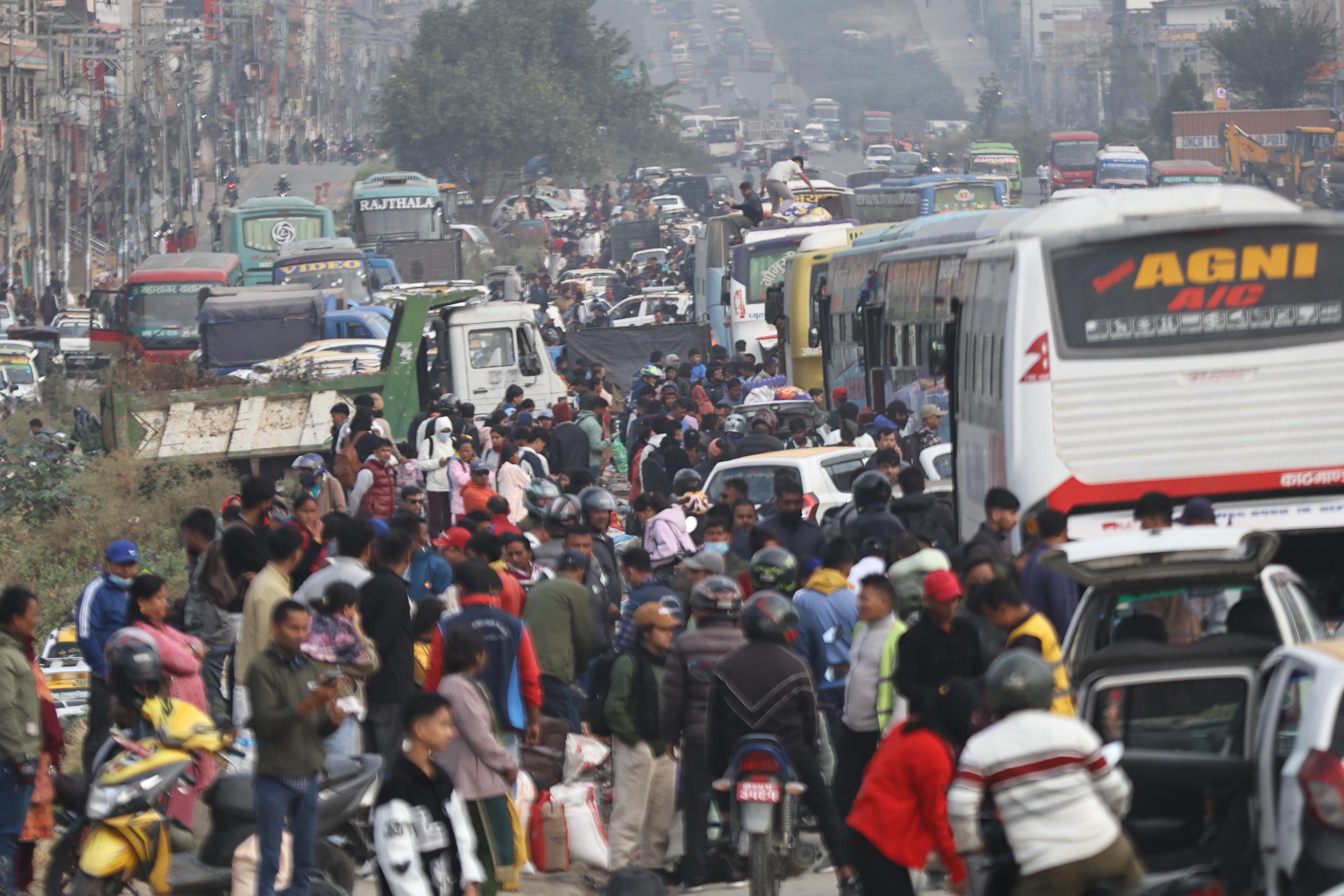 दशैँ, तिहार र छठ मनाउन गएकाहरू काठमाडौँ फर्किन थालेका छन्। काठमाडौँको कलंकी, थानकोट तथा भक्तपुरका नाकामा राजधानी फर्किनेको भिड लाग्न थालेको छ। चाडपर्व मनाउन काठमाडौँ छाडेकामध्ये शुक्रबारसम्म ९० प्रतिशत काठमाडौँ भित्रिइसकेको ट्राफिक प्रहरीले जनाएको छ। तस्वीर: फोटो लाइब्रेरी\r\n
