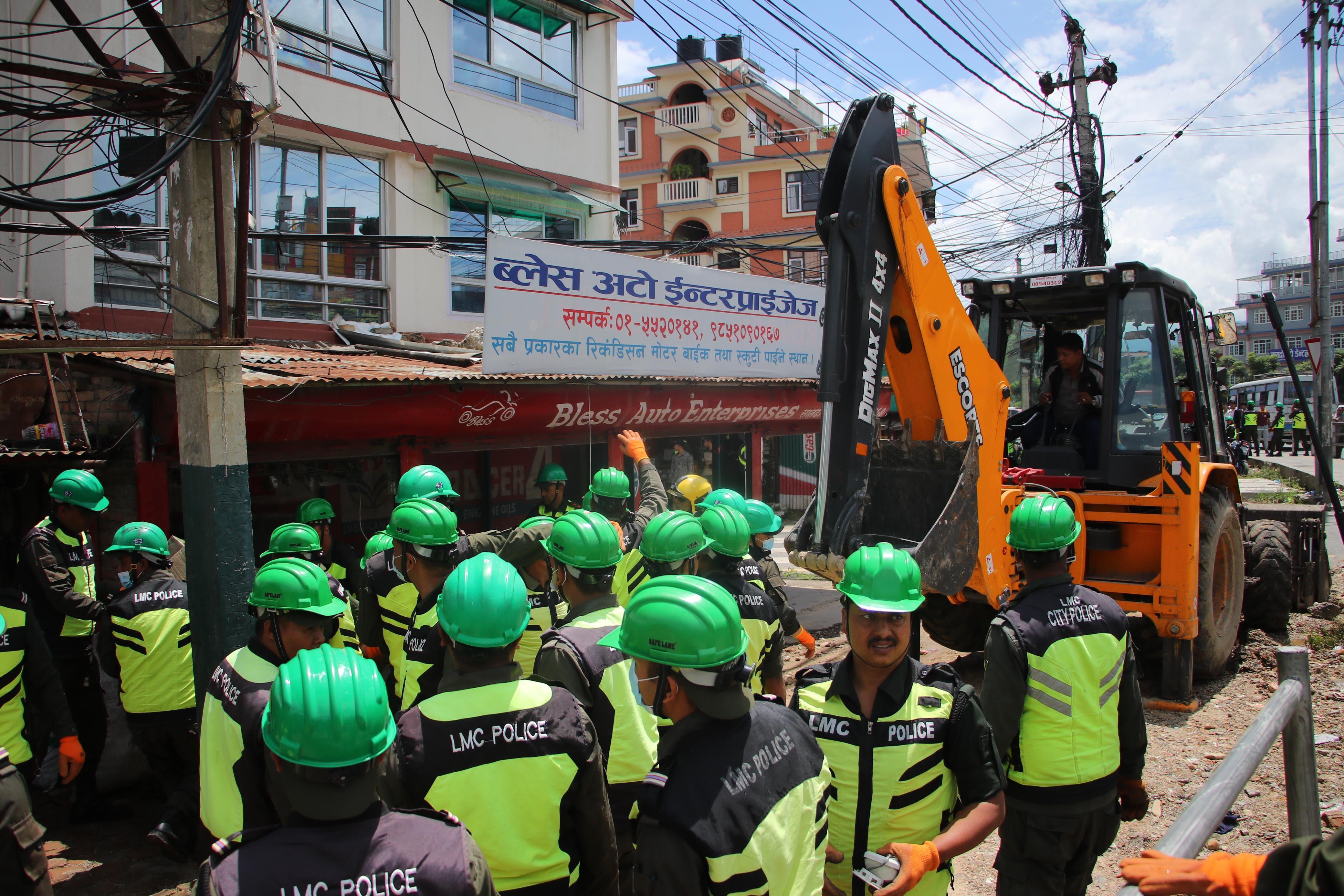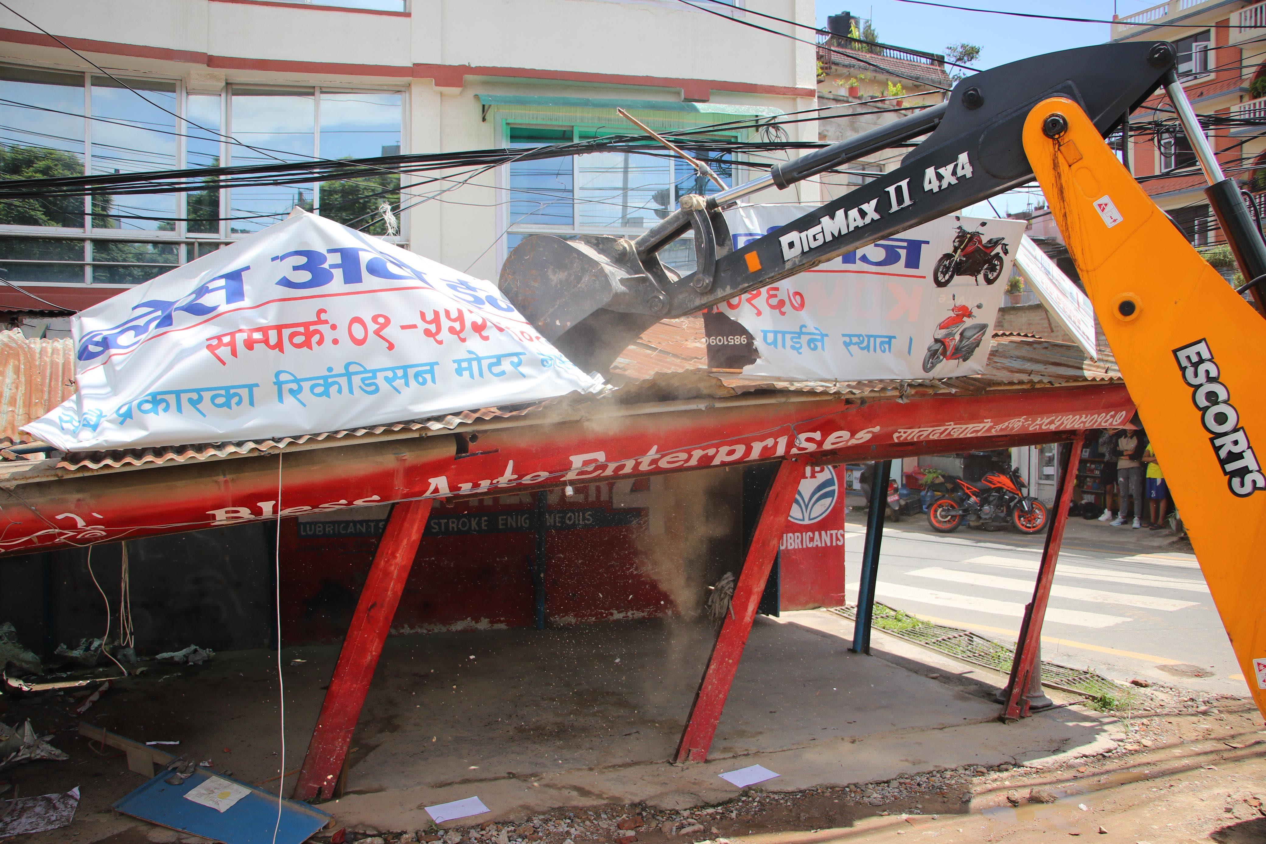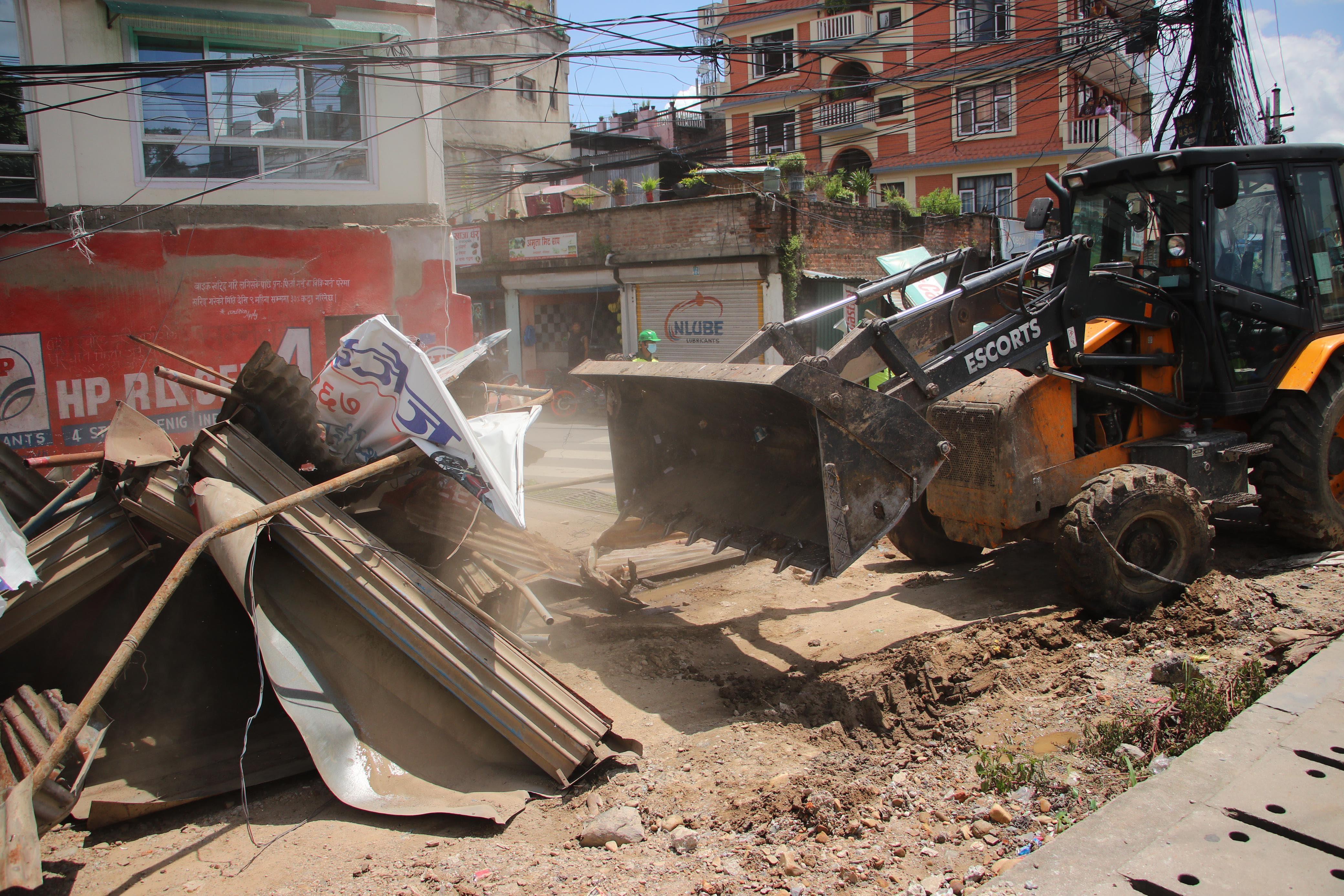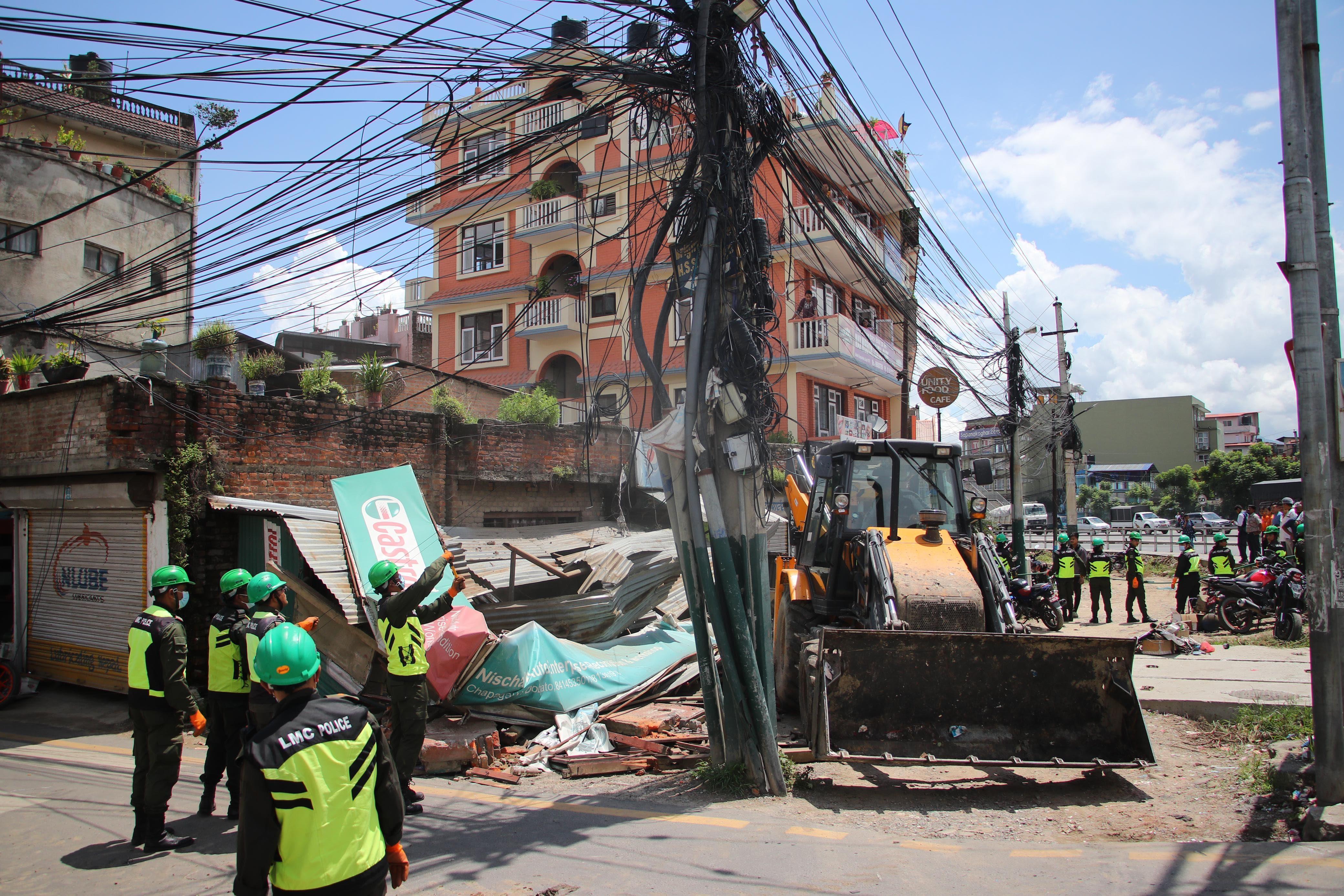 ललितपुर महानगरपालिकाले सातदोबाटोस्थित चक्रपथ छेउमा रहेका टहरामा डोजर चलाएको छ। महानगर प्रहरी बलले बिहीबार बिहान सो क्षेत्रमा रहेका नक्सापास नभएका तीनवटा टहरा भत्काएको हो। तस्वीर: नेपाल फोटो लाइब्रेरी
