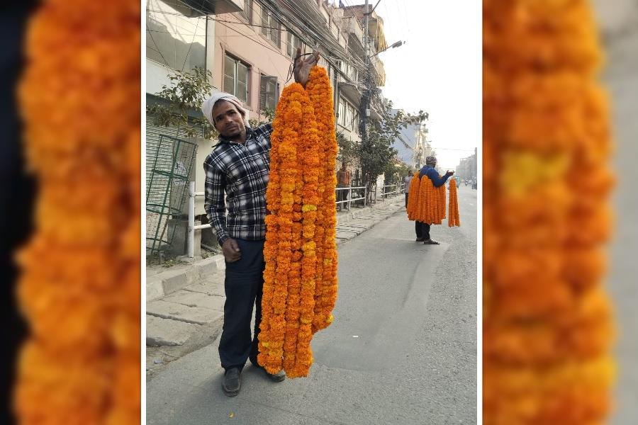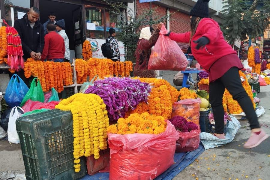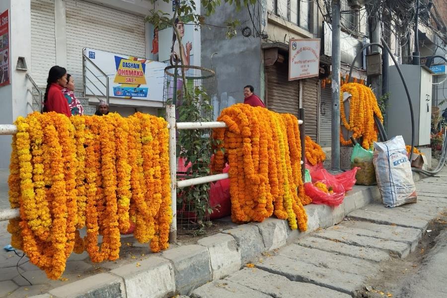 काठमाडौँका विभिन्न बजारमा बिक्रीका लागि राखिएका सयपत्री र मखमली फूल। तिहारमा फूलको माग अरू समयभन्दा बढी हुने गर्छ। तिहारलाई फूलैफूलको पर्व पनि भनिन्छ।