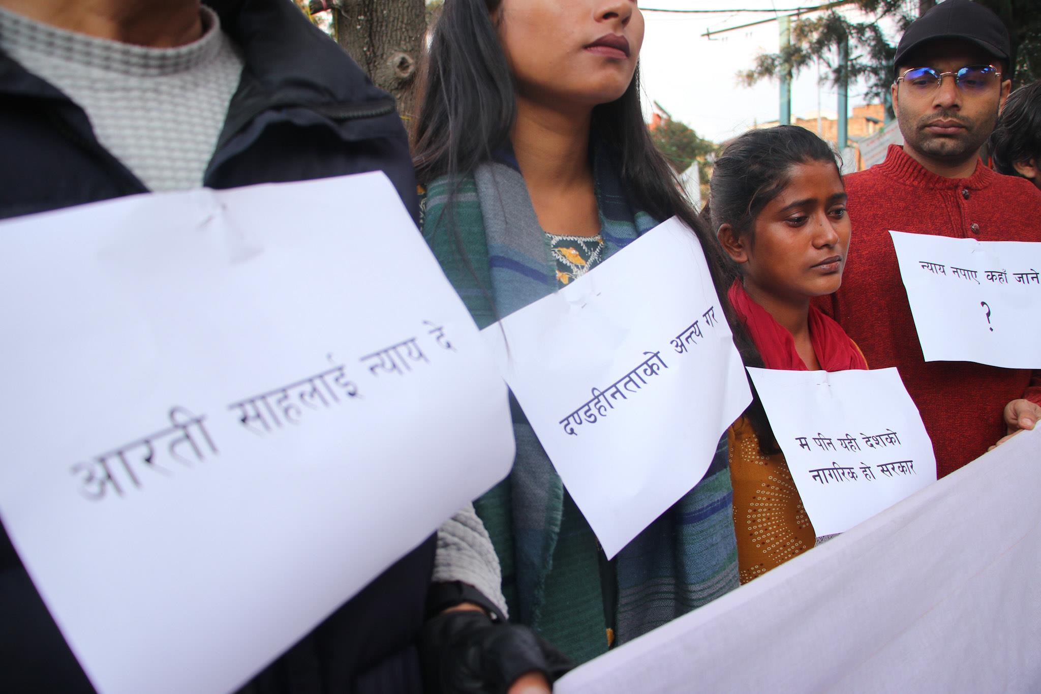 आरती साहको न्यायका लागि बृहत् नागरिक आन्दोलनले विरोध प्रदर्शन गरेको छ। आरतीको न्यायका लागि माइतीपक्ष १२१ दिनदेखि माइतीघर मण्डलमा धर्नारत थिए, तर आरती साहको आमाबुवा र भाइलाई शनिबार प्रहरीले बल प्रयोग गरी हटाएको थियो। प्रहरीले ब्यानरसमेत च्यातेर धरपकड गर्दै धर्नास्थलबाटै उनीहरूलाई हिरासतमा लिइएको विरोधमा बृहत् नागरिक आन्दोलनले आइतबार माइतीघरमा विरोध प्रदर्शन गरेको हो। बृहत् नागरिक आन्दोलनका अभियन्ताहरूले ‘आरती साहलाई न्याय दे’, ‘सरकार दण्डहीनता अन्त्य गर’, ‘म पनि यही देशको नागरिक हो सरकार’, ‘न्याय नपाए कहाँ जाने?’ लगायतका नारा लेखिएका प्लेकार्ड बोकेर विरोध प्रदर्शन गरेका थिए। विरोध प्रदर्शनमा बृहत् नागरिक आन्दोलनका अभियन्ता सञ्जीव उप्रेती, नवीन तिवारी, आरतीकी बहिनी मनिषा साहलगायत उपस्थित थिए।