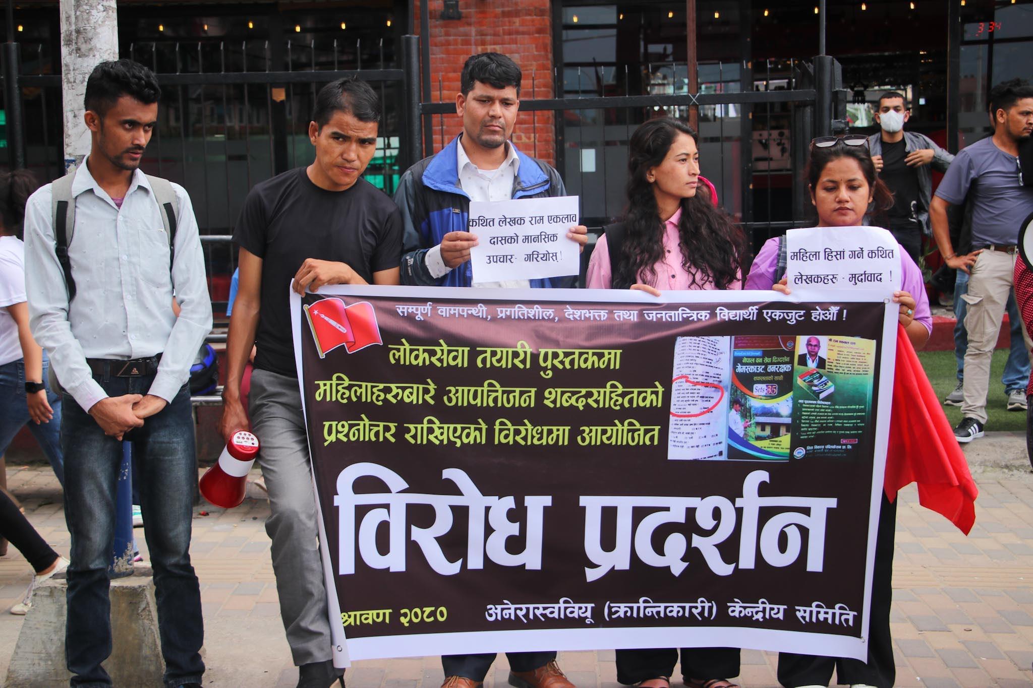 लोकसेवा तयारी पुस्तकमा महिलाबारे आपत्तिजनक शब्दसहितको प्रश्नोत्तर राखिएको भन्दै विरोध प्रदर्शन गरिएको छ। अनेरास्ववियू क्रान्तिकारीले सोमबार काठमाडौँको माइतीघरमा प्रदर्शन गरेको हो। सो क्रममा प्रदर्शनकारीले लेखक राम एकवाल दासको किताब जलाएका थिए।