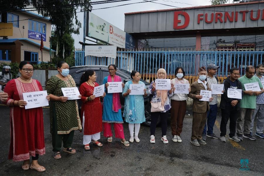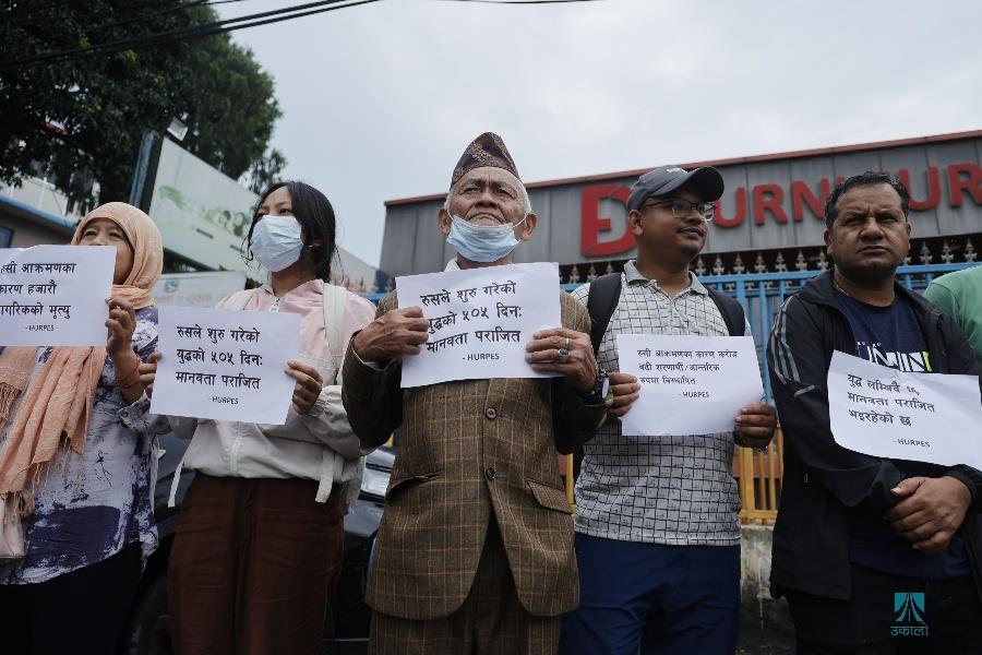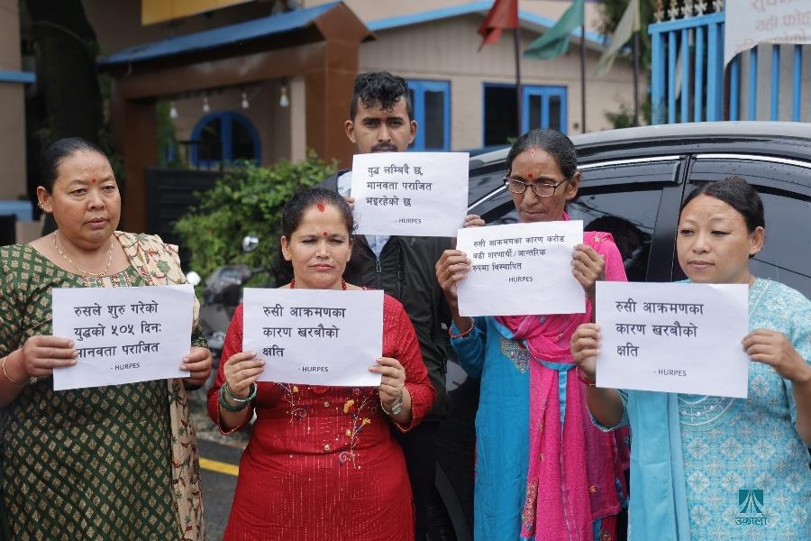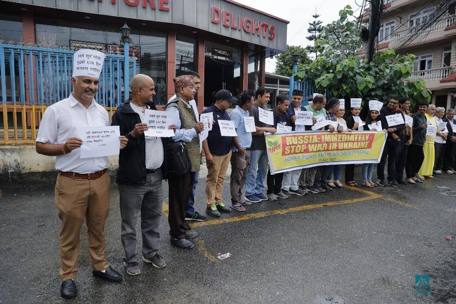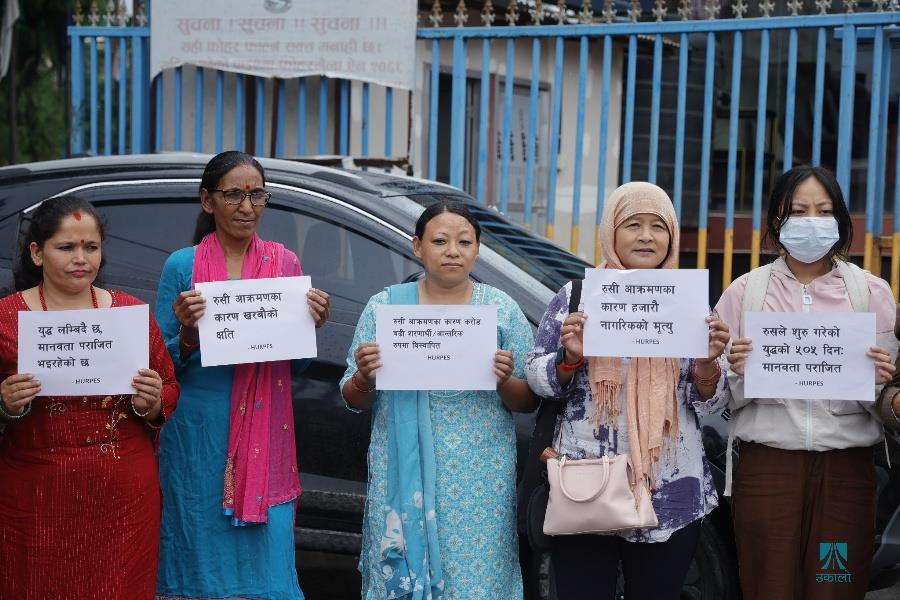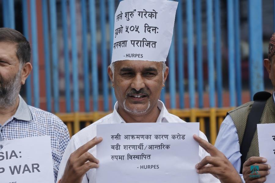 काठमाडौँ– काठमाडौँस्थित रुसी दूतावासअगाडि युक्रेनमाथिको आक्रमण तत्काल रोकी शान्ति वार्तामा आउन रुसलाई आह्वान गर्दै मानवअधिकार तथा शान्ति समाजले शान्तिपूर्ण प्रदर्शन गरेको छ। समाजले रुसी दूतावासमार्फत राष्ट्रपति भ्लादिमिर पुटिनलाई पत्र पठाउँदै तत्काल युद्ध रोकेर शान्ति कायम गर्न आग्रह गरेको छ। समाजको केन्द्रीय सभापति रामकृष्ण बरालको नेतृत्वमा भएको प्रदर्शनमा मानव अधिकारकर्मी कृष्ण पहाडी, समाजका पूर्वसभापति उत्तर पुडासैनी लगायतका अधिकारकर्मीहरूको उपस्थिति रहेको थियो। रुसले छिमेकी राष्ट्र युक्रेनमाथि आक्रमण गरेको बिहीबार ५०५औँ दिन भएको छ। २०२२ फेब्रुअरी २४ मा नेटोसँग सम्बन्धनजिक बनाएको भन्दै रुसले युक्रेनमाथि सैन्य कारबाही शुरू गरेको थियो। तस्वीर–फोटो लाइब्रेरी
