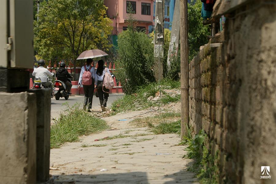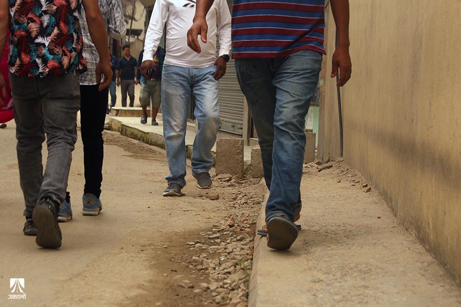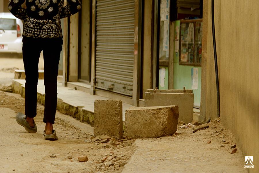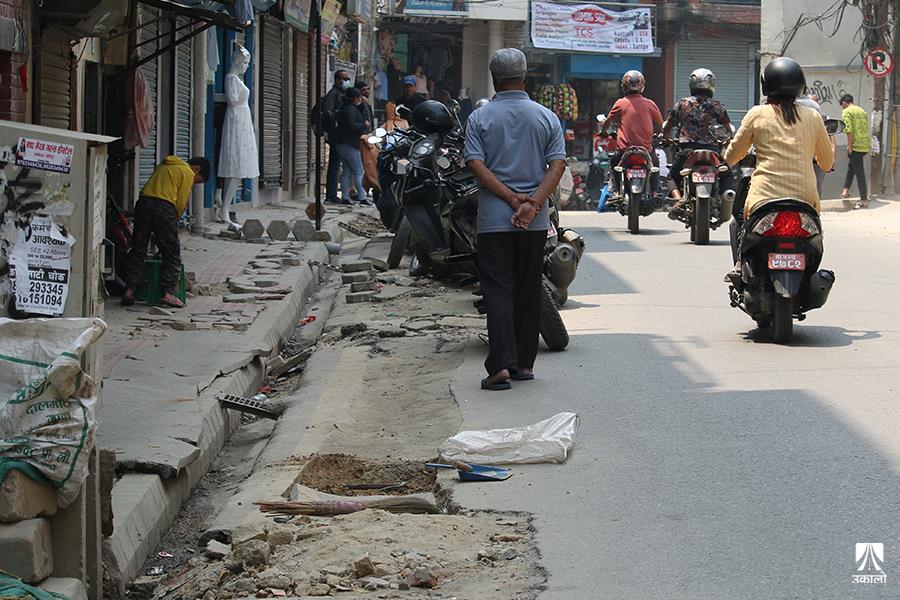 काठमाडौँका अधिकांश सडकपेटी पैदलयात्रुका लागि सहज छैनन्। सडकपेडीमा यात्रुहरू जोखिम मोलेर हिँड्न बाध्य छन्। निर्माण सामाग्री थुपारिँदा, सहायक सडक जोडिएका स्थानमा, बिजुलीका पोललगायतले जोखिम हुने गरेको छ। कतिपय स्थानमा सडकबाटै हिँड्नुपर्ने अवस्था छ। अपांगता भएका व्यक्तिलाई झनै कठिन हुने गरेको छ। तस्वीर: किसन पाण्डे/उकालो\r\n\r\n