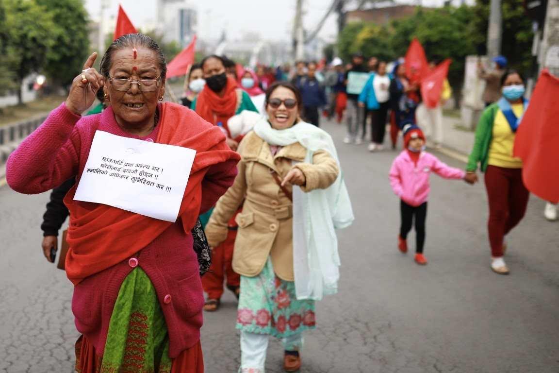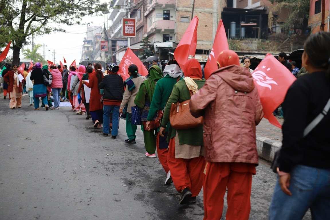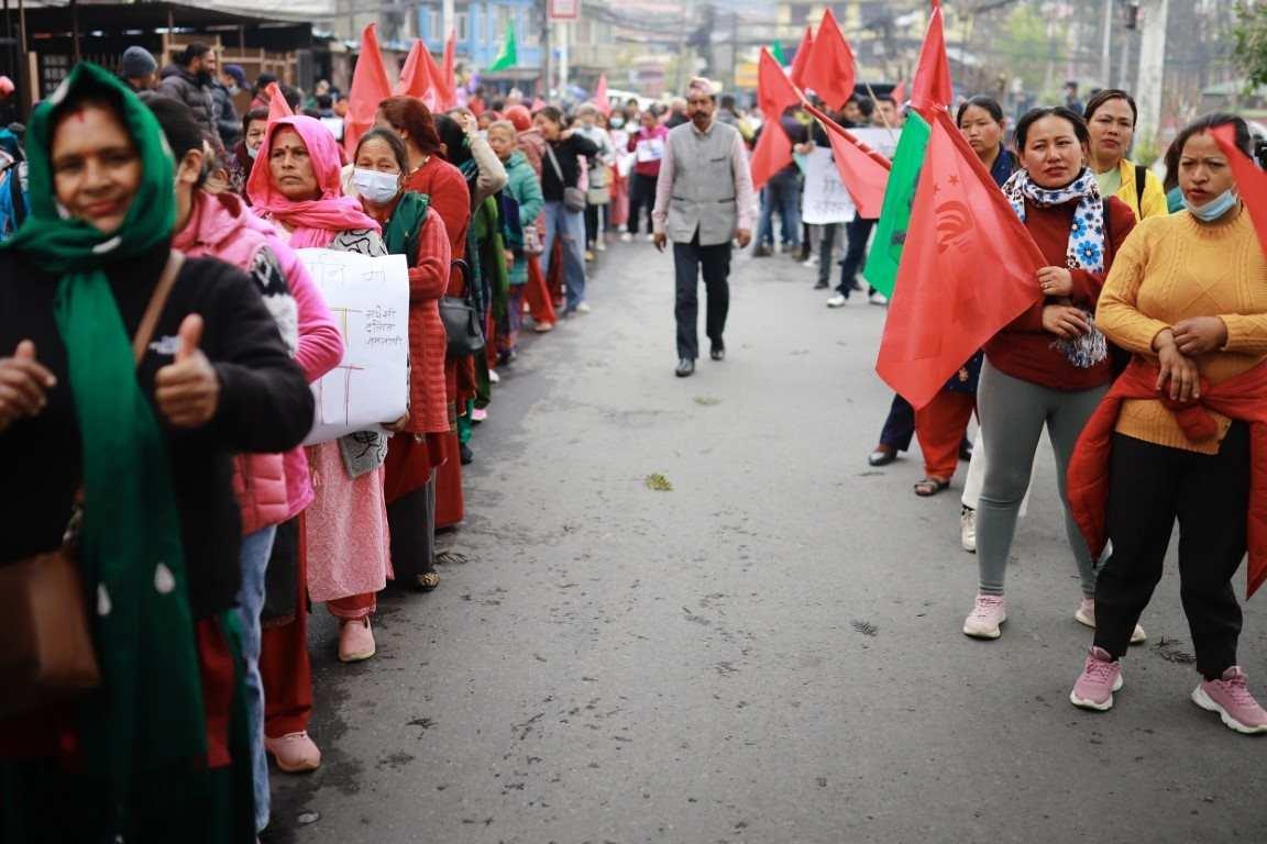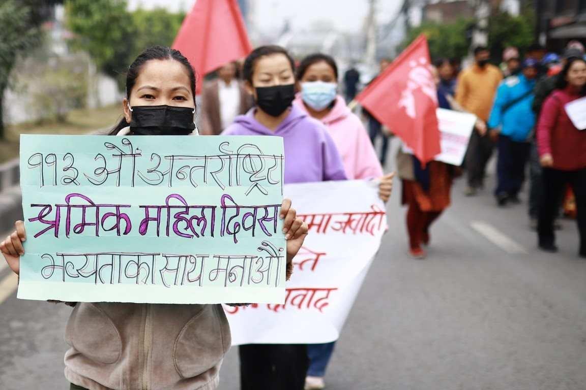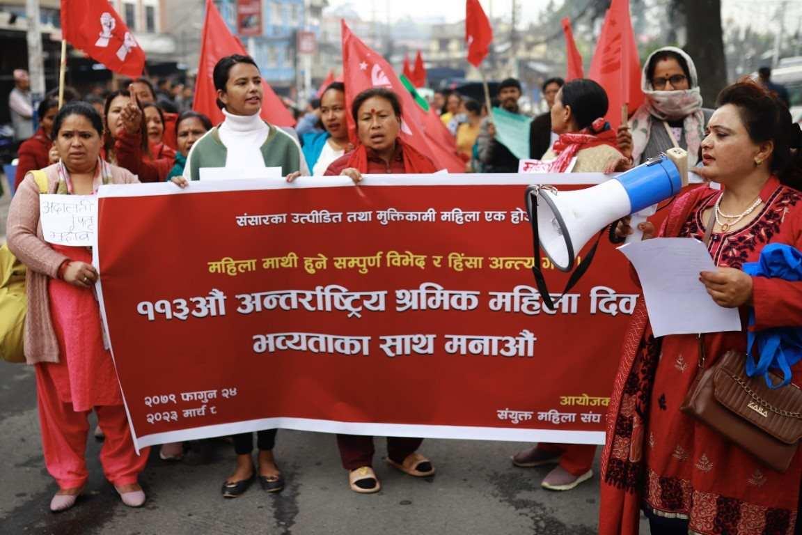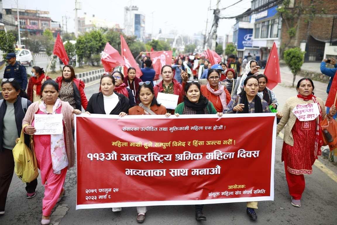 संयुक्त महिला संघ संघर्ष समितिद्वारा ११३ औँ अन्तर्राष्ट्रिय श्रमिक महिला दिवसको अवसरमा आयोजित र्याली ।