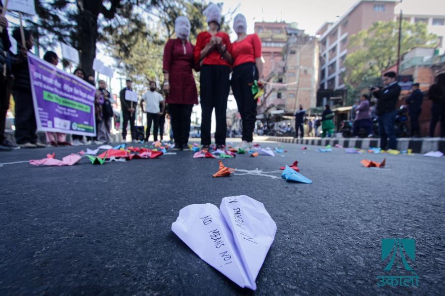 महिलामाथि हुने हिंसाविरुद्धको १६ दिने अभियानअन्तर्गत सामुदायिक वन उपभोक्ता महासंघ, नेपालको आयोजनामा \'लैंगिक हिंसाविरुद्ध सचेतनामूलक पर्फमेन्स आर्ट\' आयोजना गरिएको छ। माइतीघर मण्डलमा कलाकारहरूले नाटक प्रदर्शन गरेका हुन्। आभा फर क्रियटिभिटी समूहले \"निर्दोष पक्षी\" नामक उक्त नाटक देखाएको हुन्। तस्वीरहरू : अमित मचामसी