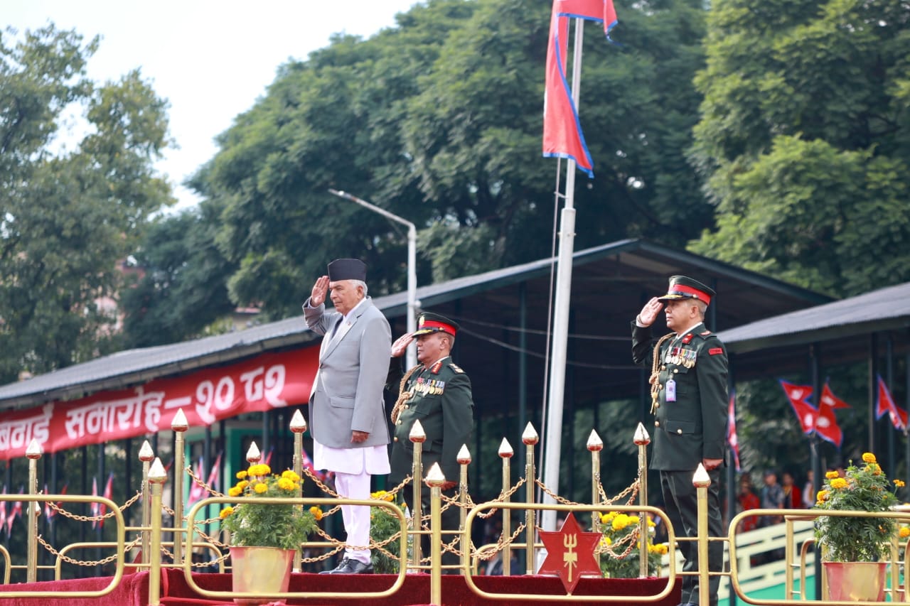 काठमाडौँ– राष्ट्रपति रामचन्द्र पौडेलको प्रमुख आतिथ्यमा सैनिक मञ्च टुँडिखेलमा सोमबार अपराह्न ‘फूलपाती बढाइँ समारोह–२०८२’ सम्पन्न गरिएको छ। समारोहमा नेपाली सेनाका परमाधिपति राष्ट्रपति पौडेलको सम्मानमा नेपाली सेनाले सलामी अर्पण गरेको थियो।