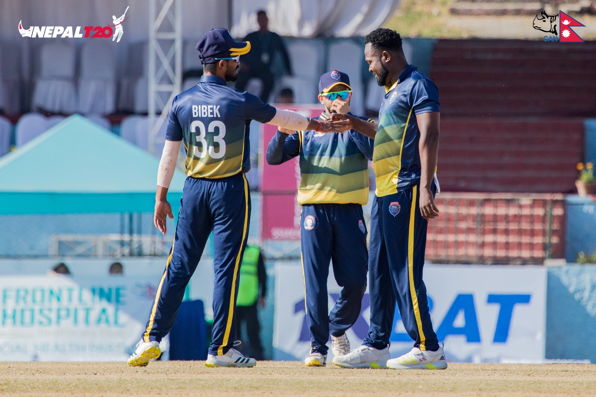 विवेक यादवले १८ बलमा ३ चौका र ३ छक्का प्रहार गर्दै ४६ रन बनाए। हुसेन टलटले ३८ र राज नाननले २३ रन बनाए।काठमाडौँका कमलसिंह ऐरी र अनिल खरेलले २/२ विकेट लिए। अभिनास बोहरा र गौतम केसीको नाममा १/१ विकेट रह्यो।
