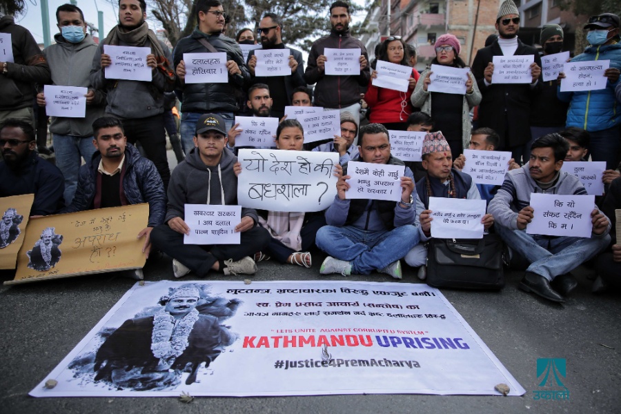 इलामका प्रेमप्रसाद आचार्यको न्यायका लागि भन्दै युवाहरूले काठमाडौँको माइतीघरमा प्रदर्शन गरेका छन्।