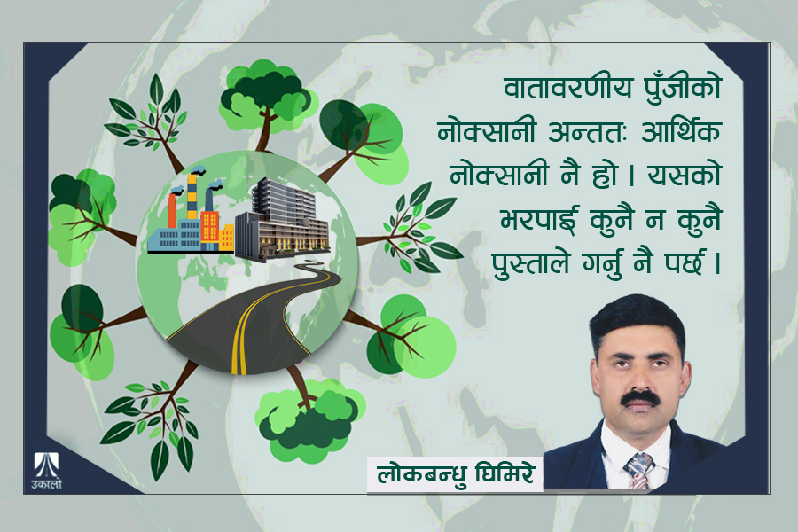 वातावरणीय पुँजीको नोक्सानी अन्ततः आर्थिक नोक्सानी नै हो, उक्त नोक्सानीको भरपाई कुनै न कुनै पुस्ताले तिर्नैपर्छ। यो त बैंकको ऋणजस्तै हो, जसलाई 'प्रकृतिको ऋण' (ग्रीन डेब्ट) पनि भनिन्छ। यदि आज हामीले सही समयमा सावाँ तिरेनौँ भने भोलिका दिनमा ब्याजको स्याज बनाएर हामीलाई टाट फर्काइदिन्छ। यसले हाम्रा आउँदा अनगिन्ती पुस्तालाई नोक्सानी गर्छ। आजको पुस्ताले भविष्यका सन्ततिको सबै भाग हसुर्न हुन्न, उनीहरूको उपभोग घटोत्तरी गर्नु हुँदैन। तर, यति गम्भीर विषय आमजनता र सरोकारवाला पक्षलाई बुझाउन सकिएको छैन।