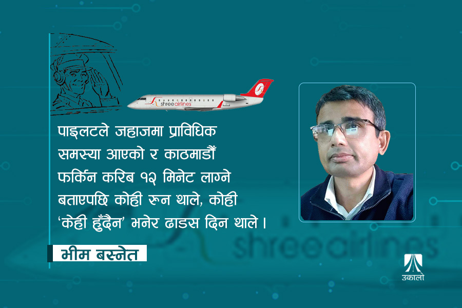 जहाज उडेको ५ मिनेटपछि नै साथीहरुले दाहिनेतर्फको पंखा कम घुमेको नोटिस गरेका रहेछन्। काठमाडौँ कट्ने बित्तिकै पाइलटले जहाजमा प्राविधिक समस्या आएकाले काठमाडौँ विमानस्थलमा अवतरण गर्ने घोषणा गरे र त्यसका लागि करिब १२ मिनेट लाग्ने बताए। त्यसपछि त जहाजमा कोही रुन थाले, कोही 'केही हुँदैन' भनेर ढाडस दिन थाले।