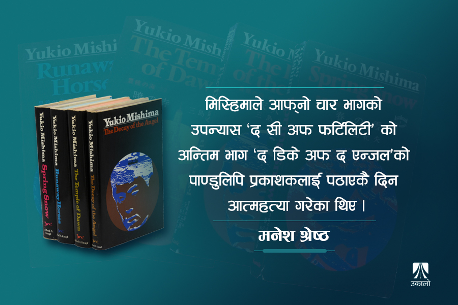 त्यही दिन बिहान मिस्हिमाले आफ्नो चार भागको उपन्यास ‘द सी अफ फर्टिलिटी’ को अन्तिम भाग ‘द डिके अफ द एन्जल’को पाण्डुलिपि प्रकाशकलाई पठाएका थिए। उनी ४५ वर्षका थिए र त्यसबखत जापानका सबैभन्दा प्रसिद्ध उपन्यासकारको रूपमा चिनिन्थे। दुई वर्ष अगाडि सन् १९६८ मा साहित्य विधामा नोबेल पुरस्कार पाउने पहिलो जापानी यासुनारी कावाबाटाभन्दा पनि प्रसिद्ध मानिन्थे।