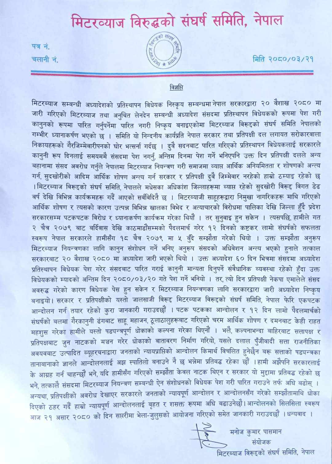 “हामी अझै पनि सरकारलाई के आग्रह गर्न चाहन्छौँ भने, यदि हामीसँग गरिएका सम्झौता केबल नाटक थिएन र सरकार यो मुद्दामा प्रतिबद्ध रहेको भने तत्काल संसद्मा मिटरब्याज नियन्त्रणसम्बन्धी ऐन संशोधन विधेयक पेश गरी पारित गराउनेतर्फ अघि बढोस्,” विज्ञप्तिमा भनिएको छ, “अन्यथा, प्रतिपक्षीको विरोध देखाएर सरकारले जनताको न्यायपूर्ण आन्दोलन र आन्दोलनसँग गरेको सम्झौतामाथि धोका दिएको ठहर गर्दै हाम्रो न्यायपूर्ण आन्दोलनलाई बृहत् र सशक्त रूपमा अघि बढ्छौँ।” समितिले बिहीबार नै आन्दोलनको सिलसिलास्वरूप सप्तरीमा भेला जुलुसको आयोजना गरेको थियो।
