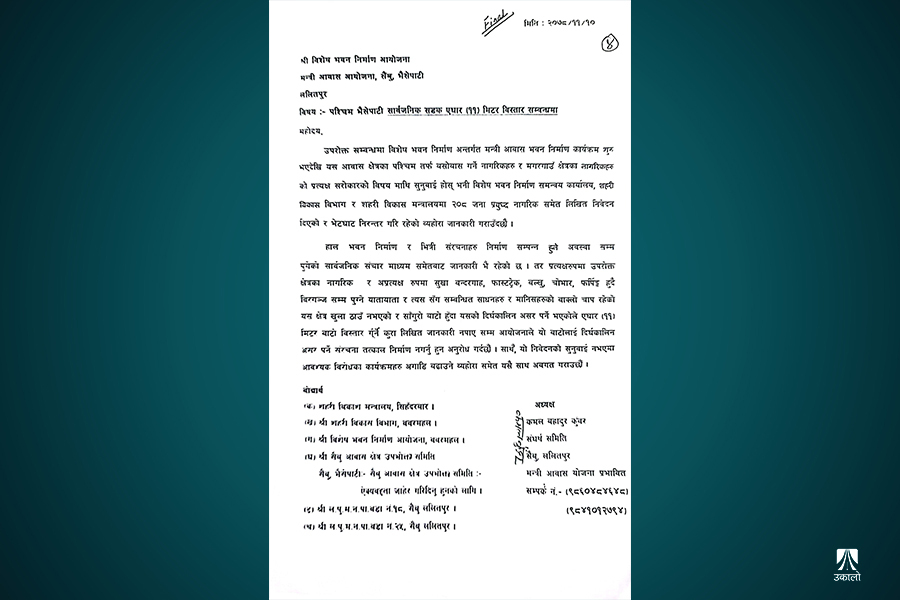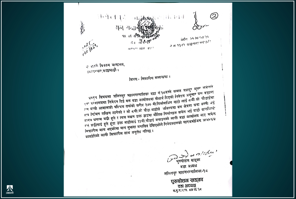 २०७८ मंसिर १६ मा ललितपुर महानगरपालिका–१८ का तत्कालीन वडाध्यक्ष पुरुषोत्तम खड्काले शहरी विकास मन्त्रालयलाई पत्र लेखेर भनेका थिए, “यस वडामा हाल मन्त्री आवासको पश्चिमतर्फको करिब २७० मिटर लामो निर्माणाधीन बाटोलाई ८ मिटर चौडाइमा मात्र सीमित राखिन लागेकाले र ८ मिटरको बाटोले भविष्यमा यस क्षेत्रमा घना बस्ती भई मानव घनत्व बढी हुने र त्यसबखत उक्त ठाउँमा भौतिक निर्माणहरूसमेत भई बाटो फराकिलो गर्न कठिनाइ हुने हुँदा उक्त बाटोलाई ११ मिटर चौडा बनाउनको लागि वडा कार्यालयबाट समेत सिफारिस माग भएकोमा माग बुझ्दा मनासिब देखिएकोले निवेदकहरूको मागबमोजिम आवश्यक कारबाहीका लागि सिफारिससाथ अनुरोध गरिन्छ।”