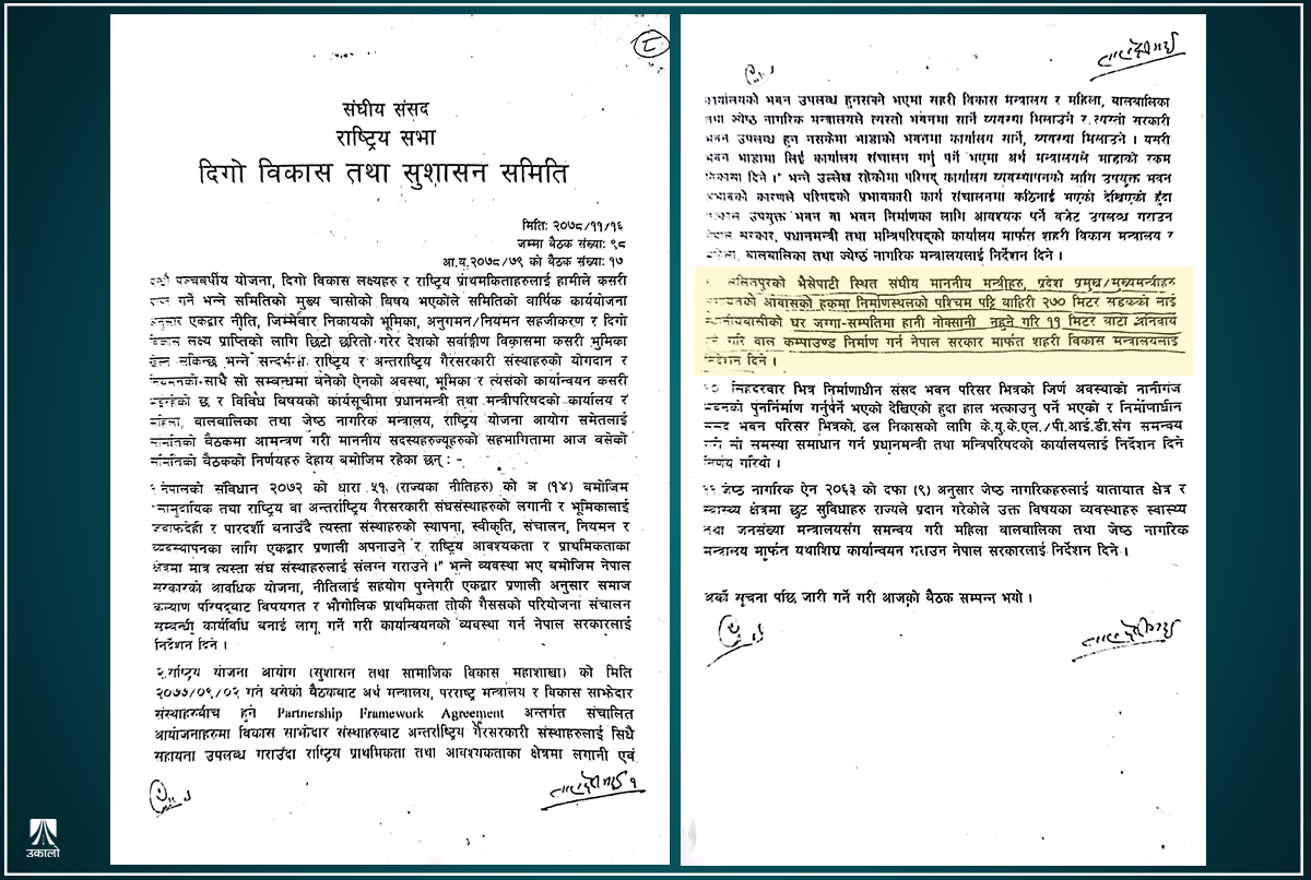 शहरी विकास तथा भवन निर्माण विभागले नक्सा पास नै नगरी मन्त्री आवास निर्माण कार्य अघि बढाएपछि ललितपुर महानगरपालिकाले उसलाई पटक–पटक ताकेता गरेको थियो। महानगरले तारन्तार ताकेता गरेपछि विभाग नक्सा पास गर्न राजी भयो।