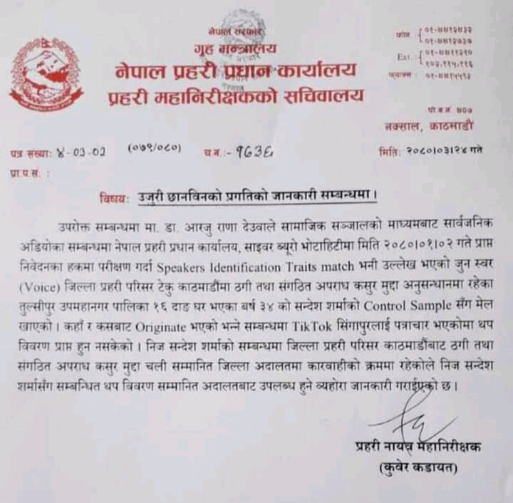 “मा. डा. आरजु राणा देउवाले सामाजिक सञ्जालको माध्यमबाट सार्वजनिक अडियोका सम्बन्धमा नेपाल प्रहरी प्रधान कार्यालय, साइबर ब्यूरो भोटाहिटीमा मिति २०८०।०१।०२ गते प्राप्त निवेदनका हकमा परीक्षण गर्दा 'स्पिकर्स आइडेन्टिफिकेसन ट्रेइट्स म्याच' भनी उल्लेख भएको जुन स्वर (भ्वाइस) जिल्ला प्रहरी परिसर टेकु काठमाडौँमा ठगी तथा संगठित अपराध कसुर मुद्दा अनुसन्धानमा रहेका तुल्सीपुर उपमहानगर पालिका १६ दाङ घर भएका वर्ष ३४ को सन्देश शर्माको 'कन्ट्रोल स्याम्पल'सँग मेल खाएको,” जानकारीमा भनिएको छ “कहाँ र कसबाट 'ओरिजिनेट' भएको भन्ने सम्बन्धमा 'टिकटक' सिंगापुरलाई पत्राचार भएकोमा थप विवरण प्राप्त हुन नसकेको।”