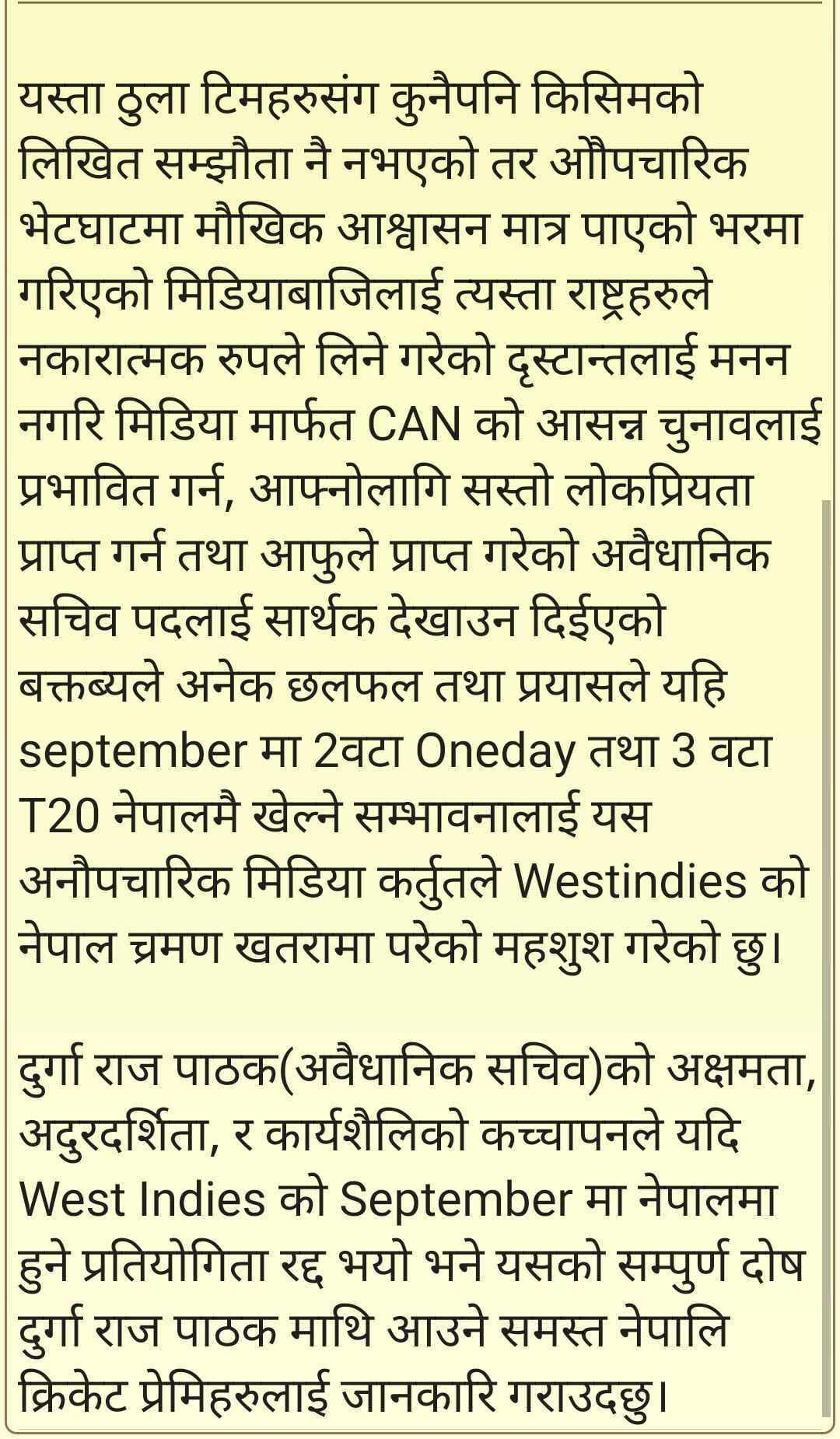 “यस्ता ठूला टिमहरूसँग कुनै पनि किसिमको लिखित सम्झौता नै नभएको तर औपचारिक भेटघाटमा मौखिक आश्वासन मात्र पाएको भरमा गरिएको मिडियाबाजीलाई त्यस्ता राष्ट्रहरूले नकारात्मक रूपले लिने गरेको दृष्टान्तलाई मनन नगरी मिडियामार्फत क्यानको आसन्न चुनावलाई प्रभावित गर्न, आफ्नो लागि सस्तो लोकप्रियता प्राप्त गर्न तथा आफूले प्राप्त गरेको अवैधानिक सचिव पदलाई सार्थक देखाउन दिइएको वक्तव्य हो,” उनले पत्रमा लेखेका छन्।