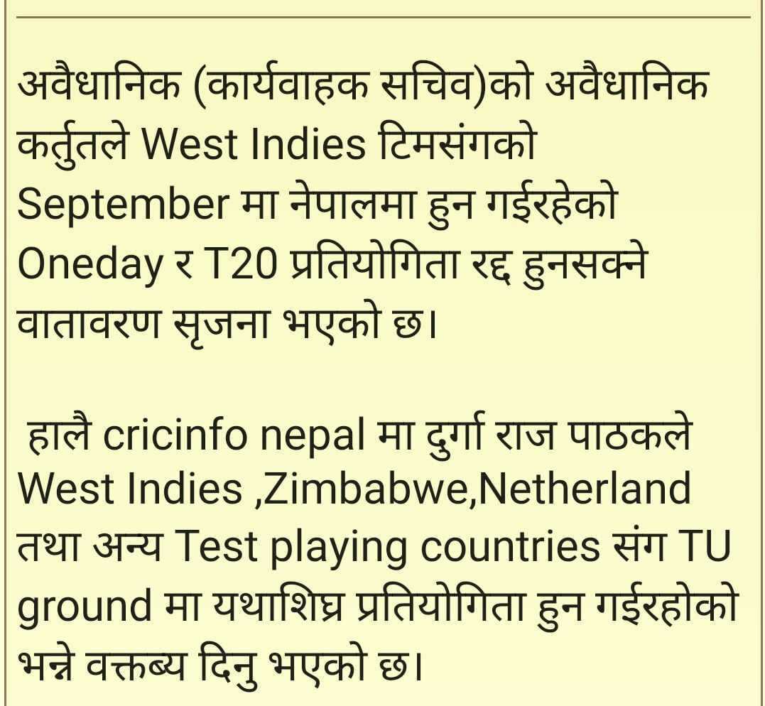 उनका अनुसार कीर्तिपुरस्थित त्रिवि क्रिकेट मैदानमा नेपालले सेप्टेम्बरमा वेस्ट इन्डिजसँग दुई एक दिवसीय तथा तीन टी-२० शृंखला खेल्ने तालिका छ। यद्यपि, औपचारिक निर्णय या कागजी प्रक्रिया पूरा भएको छैन।