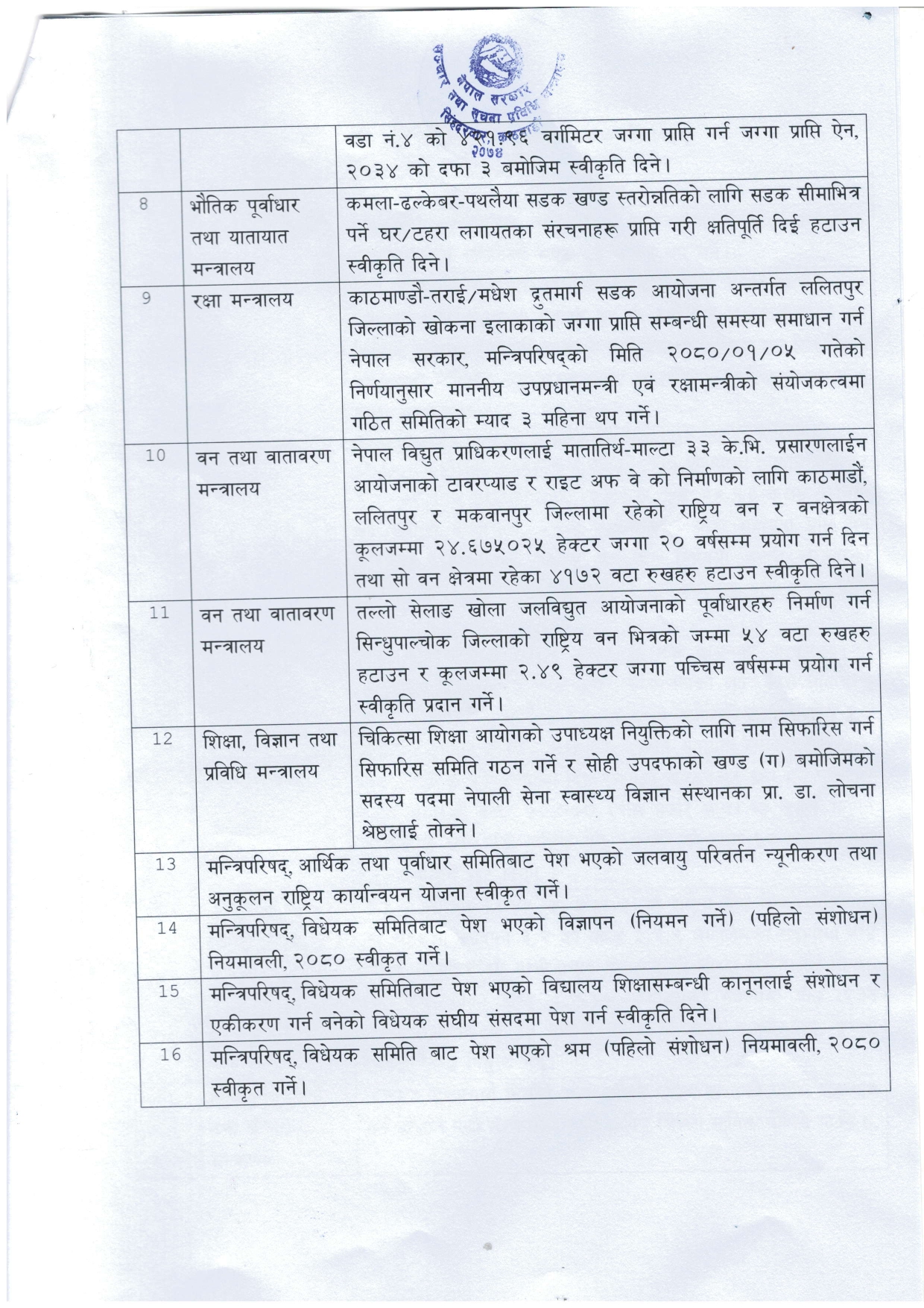 त्यस्तै, कमला–ढल्केवर–पथलैया सडक खण्ड स्तरोन्नतिका लागि सडक सीमाभित्र पर्ने घर टहरा लगायतका संरचना प्राप्ति गरी क्षतिपूर्ति दिई हटाउन स्वीकृति दिने र काठमाडौँ–तराई मधेश द्रुतमार्ग सडक आयोजनाअन्तर्गत ललितपुरको खोकना इलाकाको जग्गा प्राप्तिसम्बन्धी समस्या समाधान गर्न नेपाल सरकार मन्त्रिपरिषद्को वैशाख ५ गतेको निर्णयअनुसार रक्षामन्त्रीको संयोजकत्वमा गठित समितिको म्याद तीन महिना थप गर्ने निर्णय गरेको छ।
