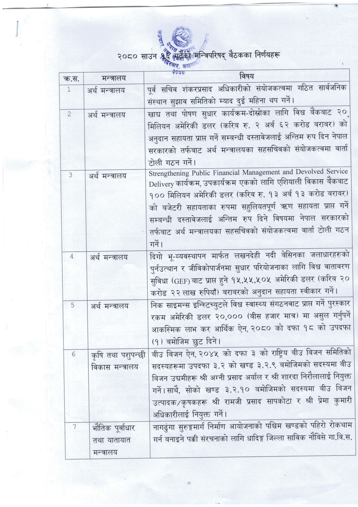 पूर्वसचिव शंकरप्रसाद अधिकारीको संयोजकत्वमा गठित सार्वजनिक संस्थान सुझाव समितिको दुई महिना म्याद थप गर्ने, निक साइमन्ड्स इन्स्टिच्युटले विश्व स्वास्थ्य संगठनबाट प्राप्त गर्ने पुरस्कार रकम अमेरिकी डलर २० हजारमा असुल गर्नुपर्ने आकस्मिक लाभ कर आर्थिक ऐन २०८० को दफा १८ को उपदफा १ बमोजिम छुट दिने निर्णय गरेको छ।