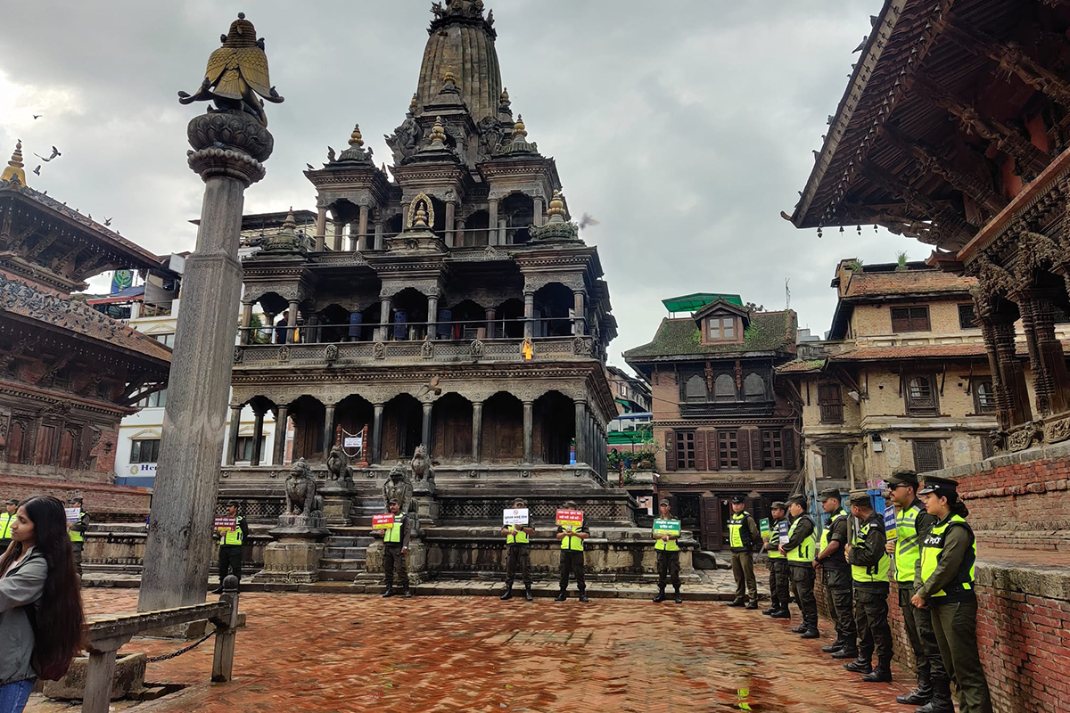 काठमाडौँ– साउन २० गते शनिबार दिउँसो पाटन दरबार क्षेत्र परिसरमा ललितपुर महानगरपालिकाका केही नगर प्रहरीहरू देखा पर्छन्। ट्रकमा राखेर ल्याइएको ‘नो इन्ट्री’ लेखिएको सूचनापाटी त्यहाँको विश्वनाथ र हरिशंकर मन्दिरको माथिल्लो पेटीमा राख्छन्।