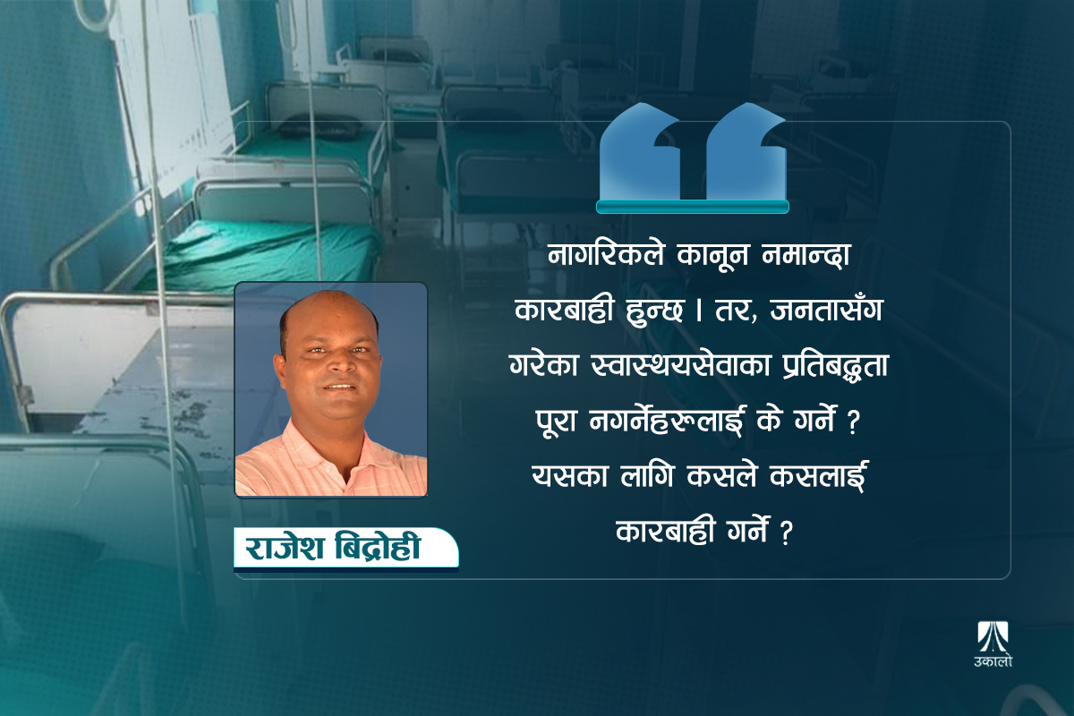 हाम्रो राज्य र सरकार सञ्चालकहरूले स्वास्थ्य लगायत आधारभूत आवश्यकताको क्षेत्रलाई निजीकरण बढी र सरकारीकरणलाई कम प्राथमिकता दिइरहेछन्। एक पटक शुरू गरिएको स्वास्थ्य बिमा कार्यक्रमसमेत प्रभावकारी रूपमा अघि बढाउन सकेन। त्यसैले यो विकृति भत्काउन जरुरी छ। जनताको स्वास्थ्योपचार राज्यको अनिवार्य दायित्त्व र कर्तव्य हो। आजसम्मको आन्दोलन र विद्रोहले यसमा प्रतिबद्धता जाहेर गरेका छन्। पटक–पटक गरेको प्रतिबद्धता कार्यान्वयन गर्दा उक्त दायित्व पनि पूरा गर्न सम्भव छ। नागरिकले कानून नमान्दा कारबाही हुन्छ। जेल कोचिन्छ। तर, जनतासँग गरेका स्वास्थयसेवाका प्रतिबद्धता पूरा नगर्नेहरूलाई के गर्ने? यसका लागि कसले कसलाई कारबाही गर्ने?