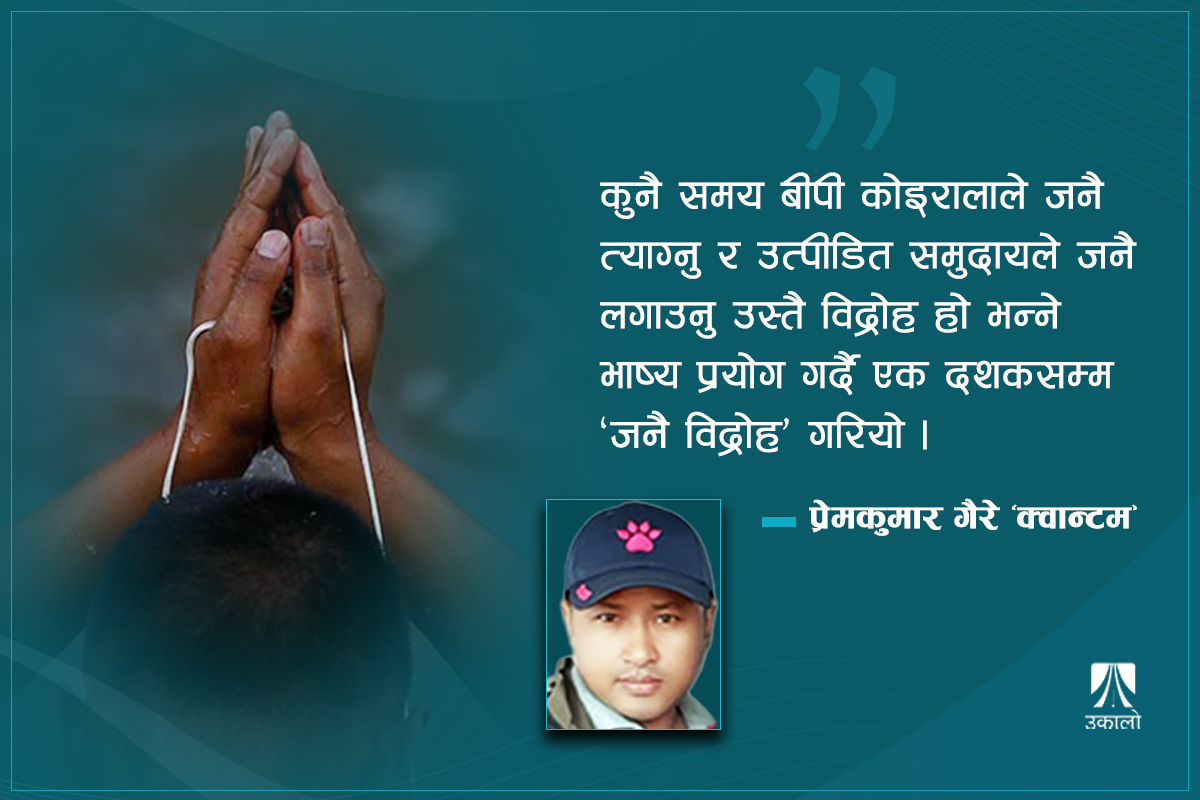 कुनै समय बीपी कोइरालाले जनै त्याग्नु र उत्पीडित समुदायले जनै लगाउनु उस्तै विद्रोह हो भन्ने भाष्य प्रयोग गर्दै एक दशकसम्म 'जनै विद्रोह' गरियो।