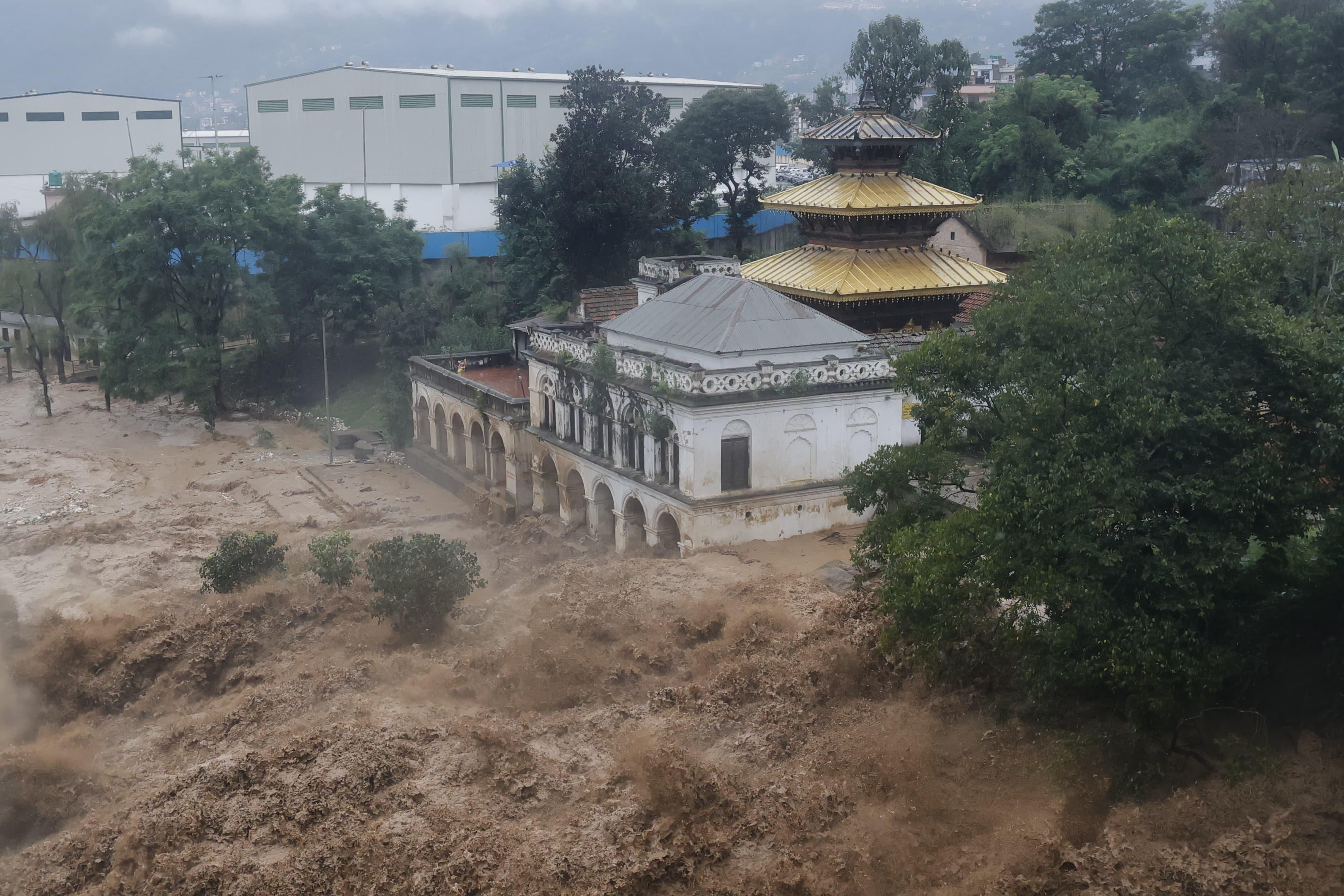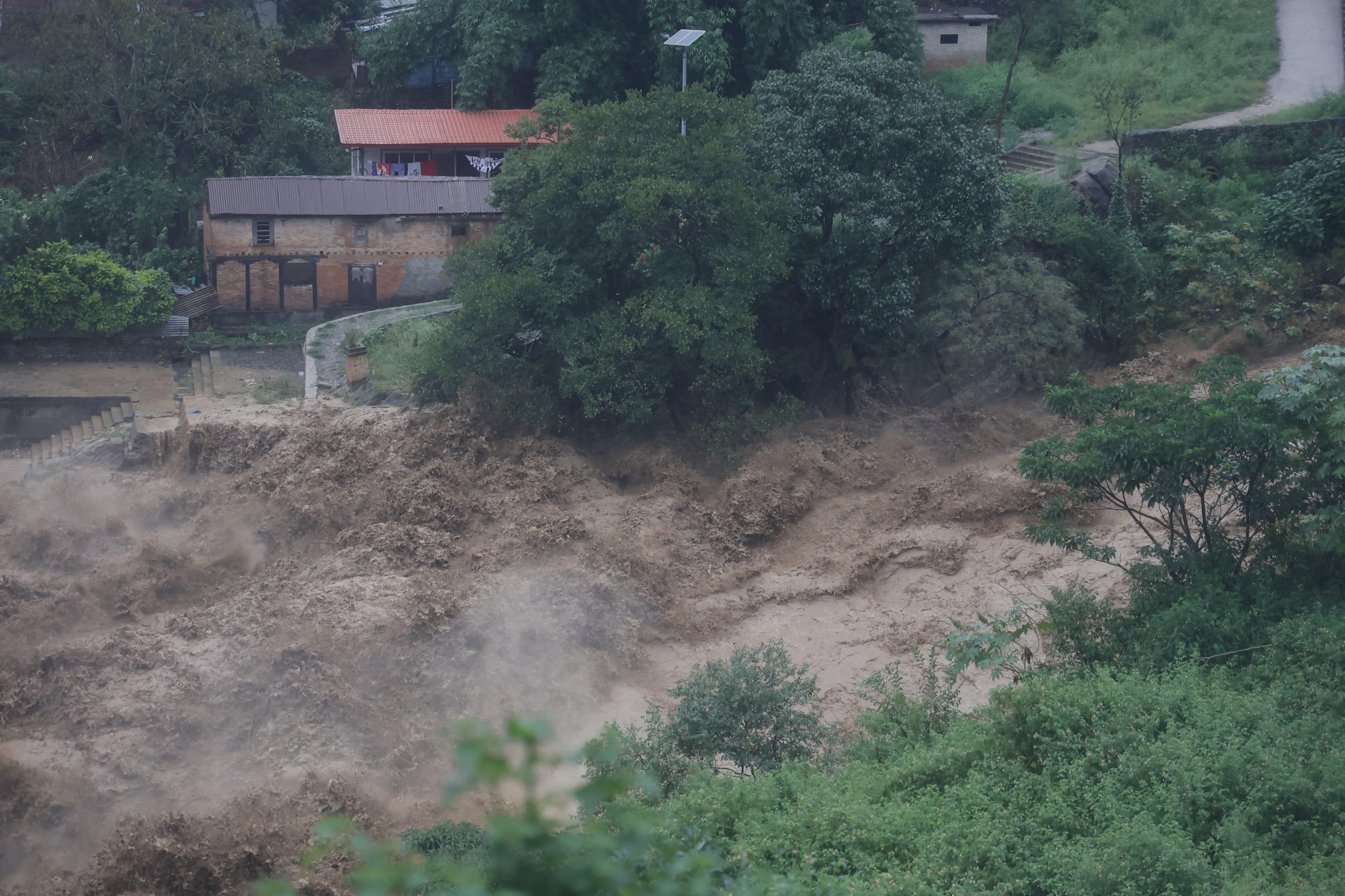 अविरल वर्षाका कारण बागमती नदीमा भिषण बाढी आएको छ। काठमाडौँ, ललितपुर र भक्तपुरका सबै खोलाको पानी मिसिएपछि बागमती उर्लिएको छ। चोभारको गल्छीबाट बाढी वस्तीमा पसेको छ। उपत्यकाको पानी बाहिरिने एक मात्र बाटो गल्छी हो। तस्वीर: नेपाल फोटो लाइब्रेरी\n