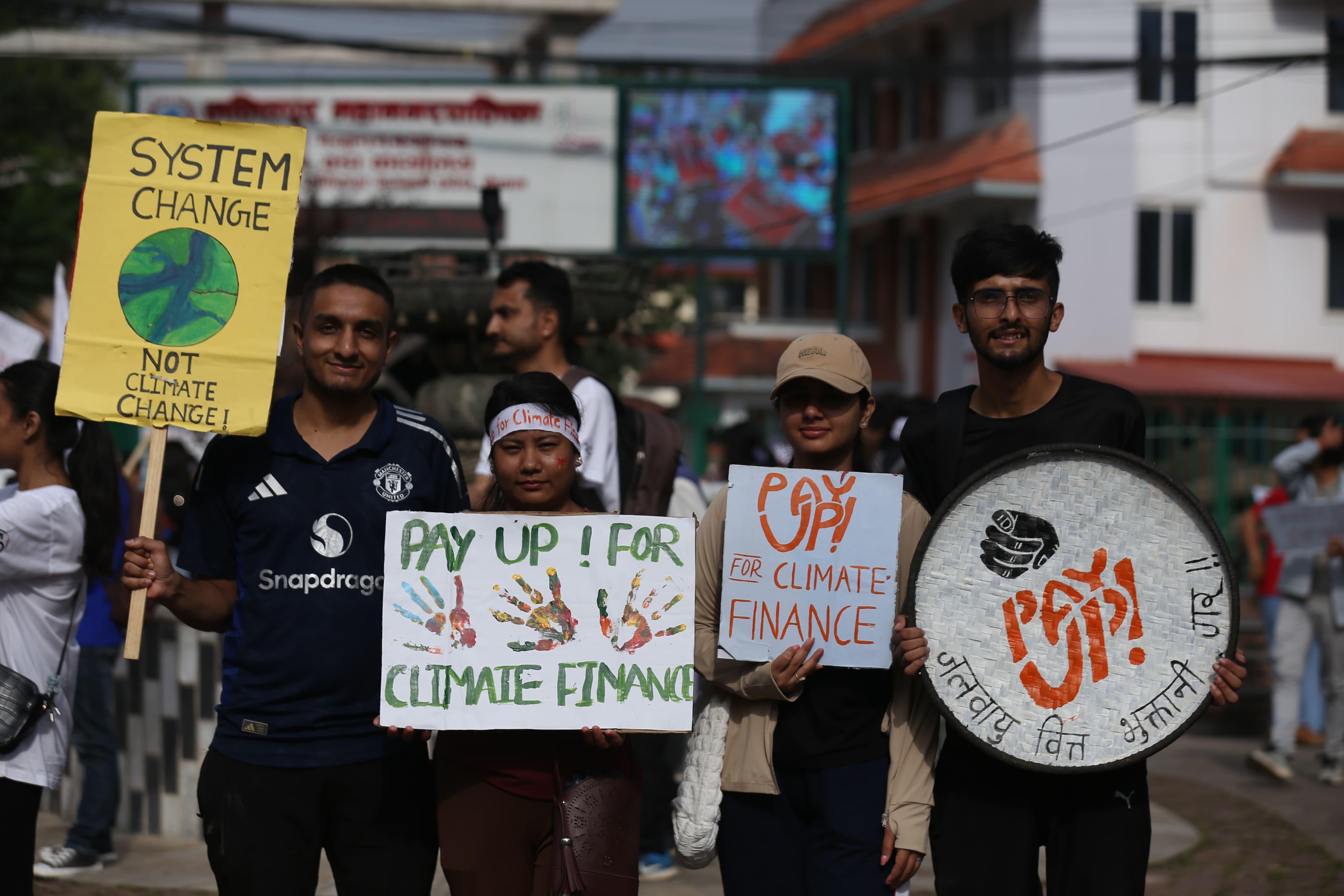 जलवायु न्यायको माग गर्दै युवाहरूले ललितपुरको जावलाखेलमा ‘पिल्स क्लाइमेट मार्च २०२४’ गरेका छन्। र्यालीमा सहभागीले विकसित मुलुकहरू खनिज, पेट्रोलियम एवं औद्योगिक उत्सर्जनबाट प्रदूषण बढाउन मुख्य जिम्मेवार रहेको र यसको मारमा नेपाल जस्ता राष्ट्र परेको भन्दै क्षतिपूर्ति तिर्नुपर्ने माग गरेका छन्। विकसित देशले नेपाल जस्तो कम हरितगृह ग्यास उत्सर्जन गर्ने देशलाई तिर्नुपर्ने दायित्व पनि ऋणका रूपमा दिन खोजेको भन्दै विरोध गरेका छन्। तस्वीर: नेपाल फोटो लाइब्रेरी
