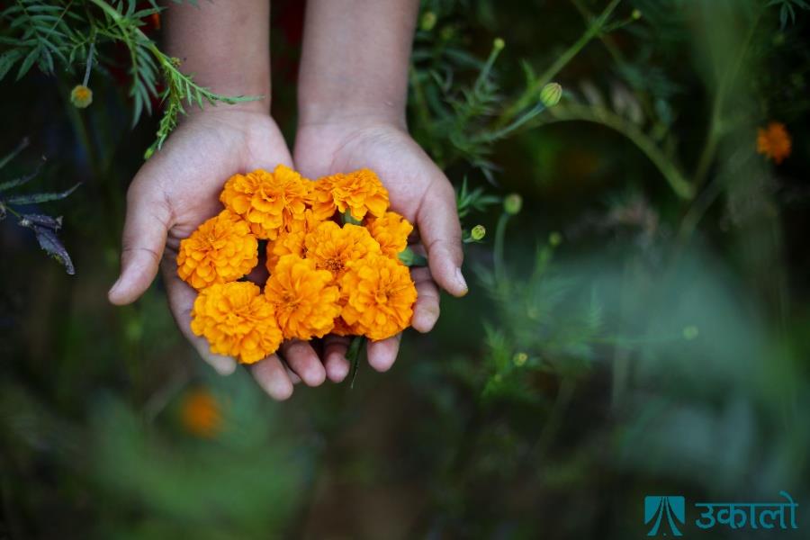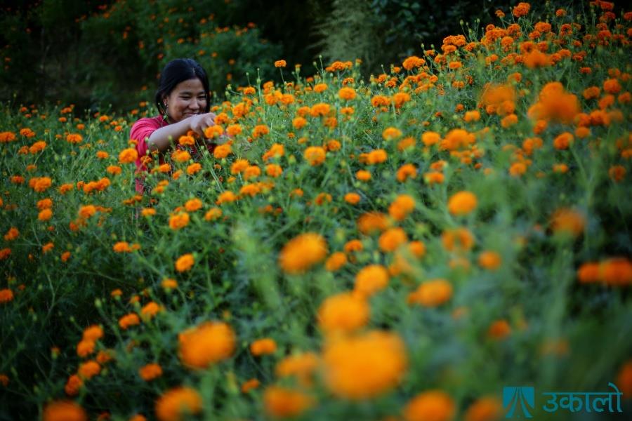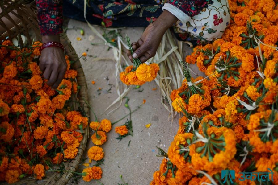 काठमाडौँको इचागुका किसान सयपत्री फूल टिप्न व्यस्त छन्। फूल र झिलिमिलीको पर्व तिहारलाई लक्षित गरेर किसानहरूले फूल टिप्ने र माला उन्ने गरिरहेका हुन्। दीपावलीमा घरलाई सजाउन फूलको खपत धेरै हुने गर्छ। तस्वीरहरू: अमित मचामसी