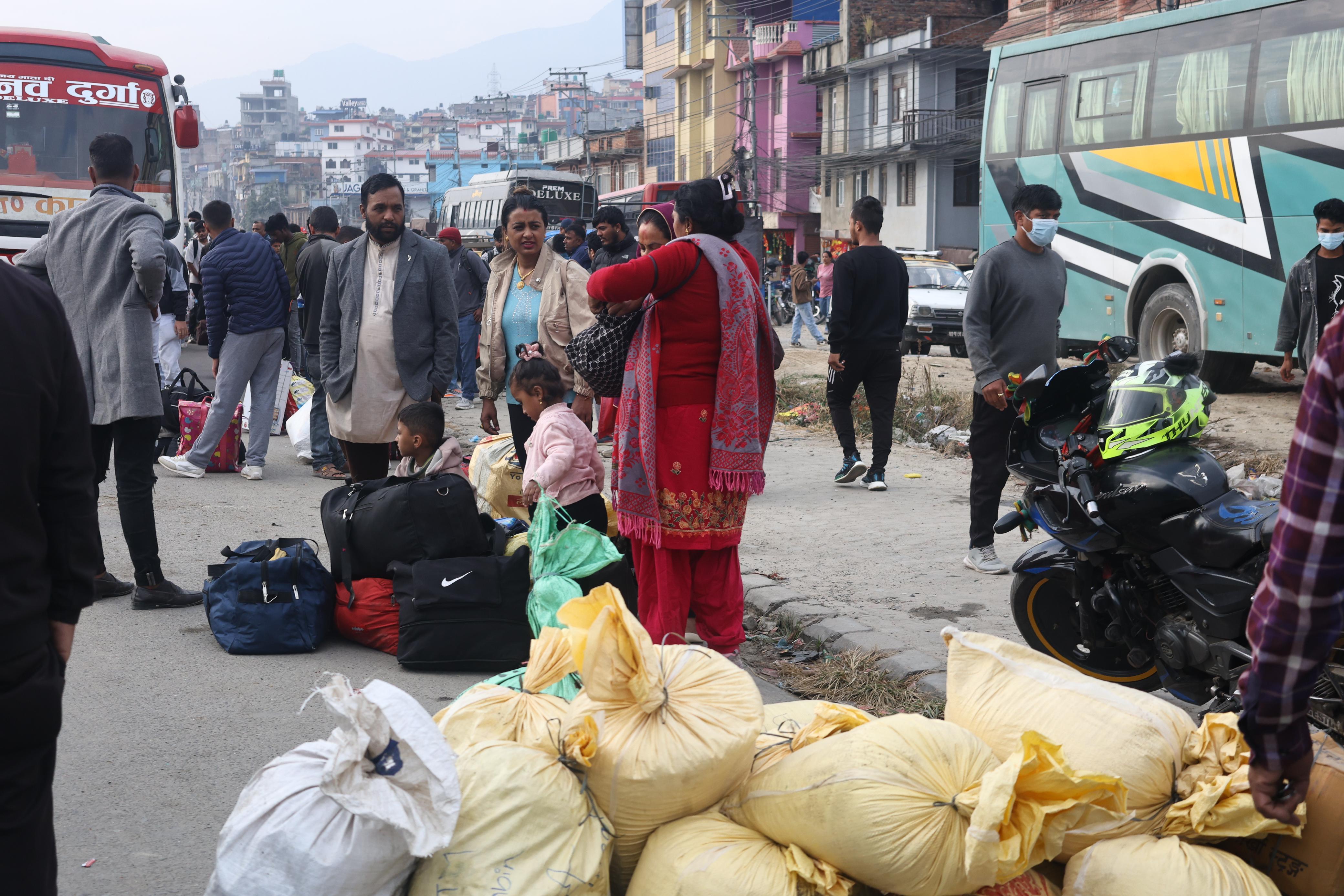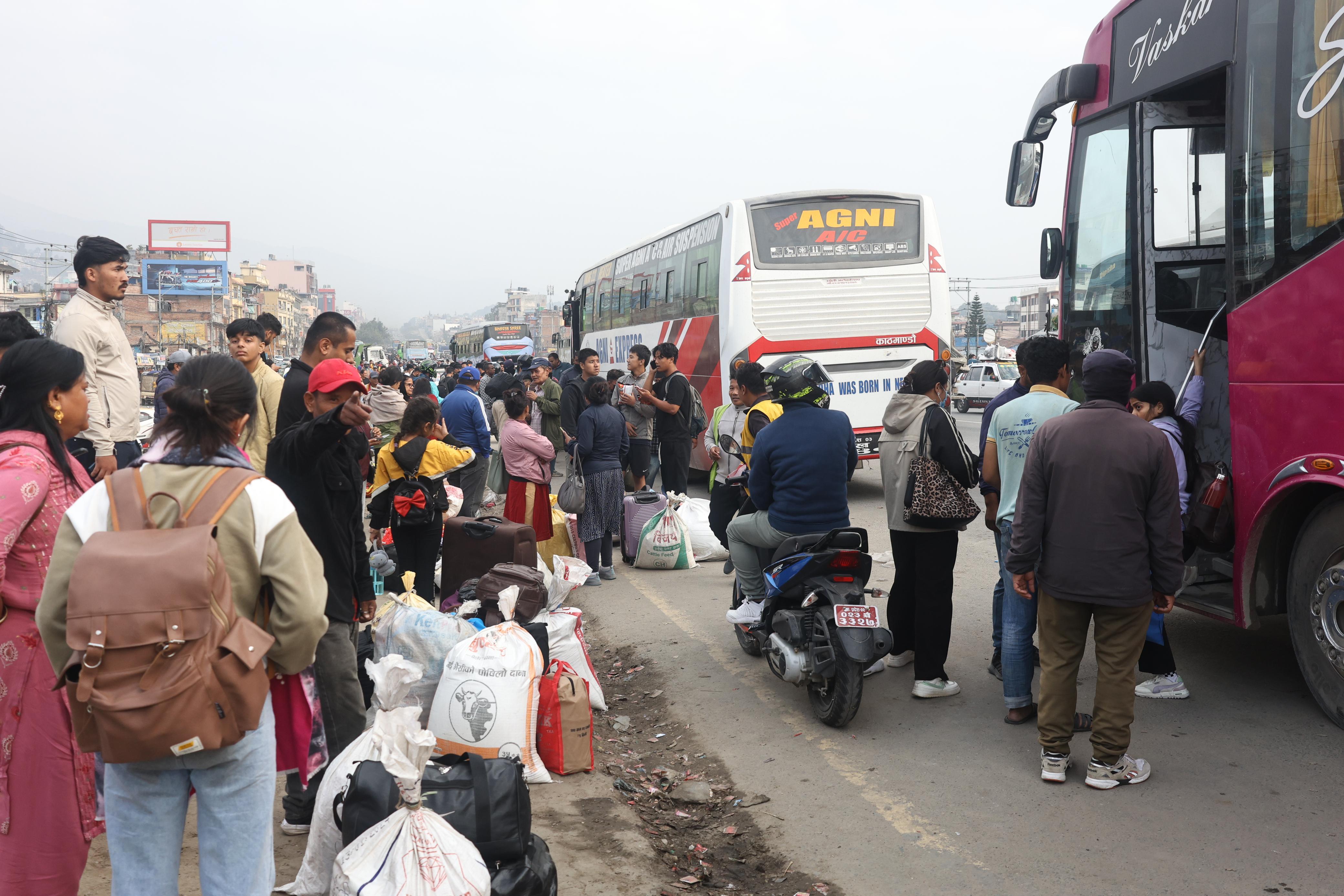 दशैँ, तिहार र छठ मनाउन गएकाहरू काठमाडौँ फर्किन थालेका छन्। काठमाडौँको कलंकी, थानकोट तथा भक्तपुरका नाकामा राजधानी फर्किनेको भिड लाग्न थालेको छ। चाडपर्व मनाउन काठमाडौँ छाडेकामध्ये शुक्रबारसम्म ९० प्रतिशत काठमाडौँ भित्रिइसकेको ट्राफिक प्रहरीले जनाएको छ। तस्वीर: फोटो लाइब्रेरी\r\n