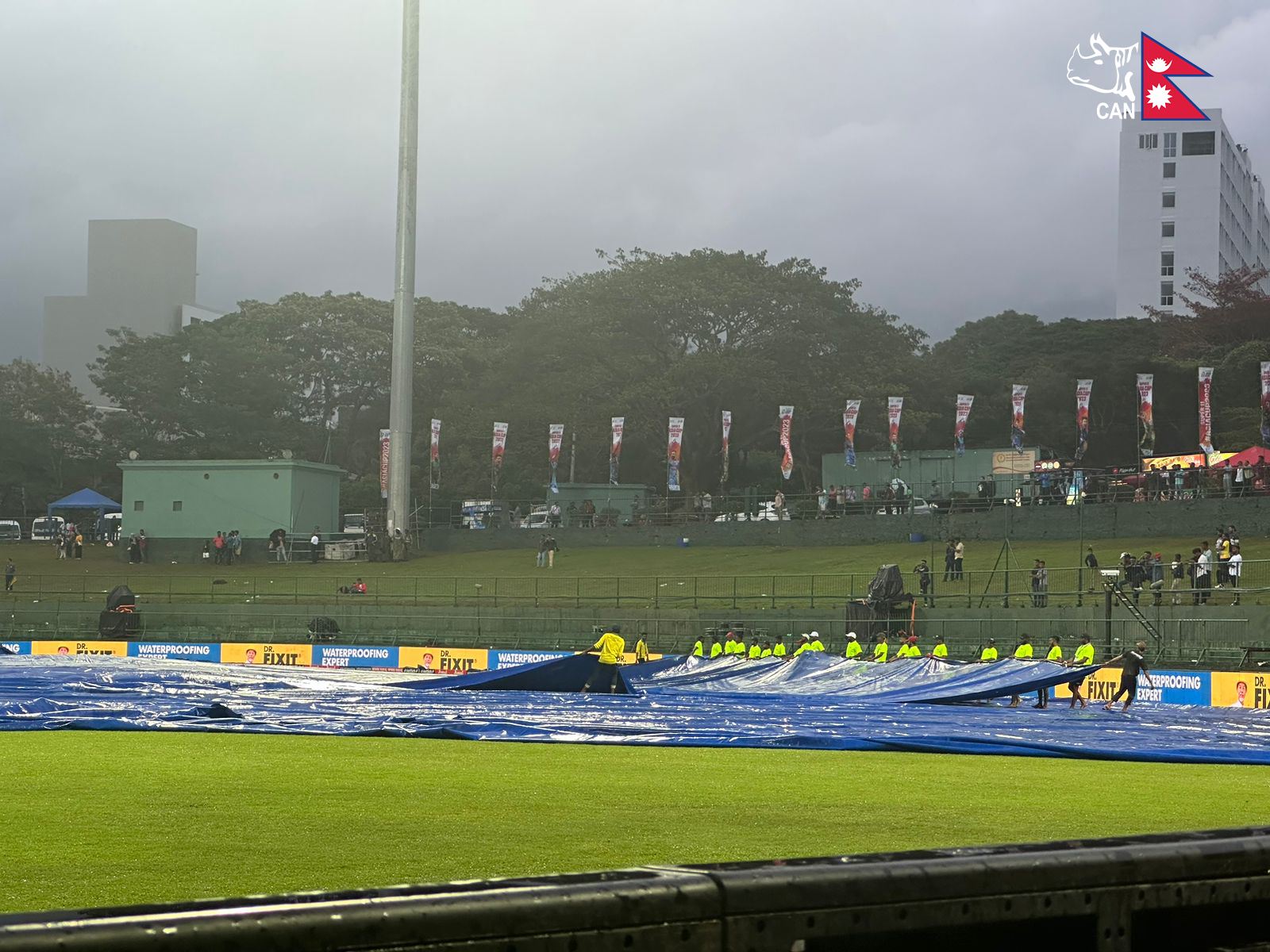 नेपालले ३७.५ ओभरमा ६ विकेट गुमाएर १७८ रन बनाउँदा वर्षाका कारण खेल केहीबेर रोकिएको थियो। पुनः खेल सुचारु गर्नका लागि अहिले मैदानलाई ढाकिएको पाल हटाउन थालिएको छ।