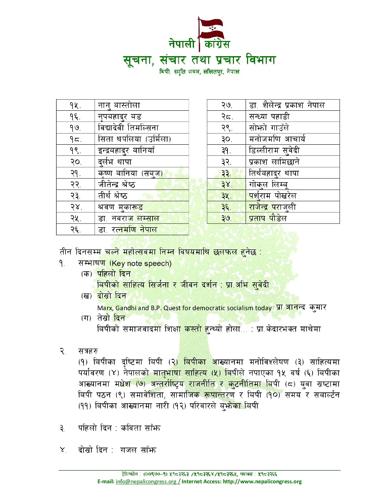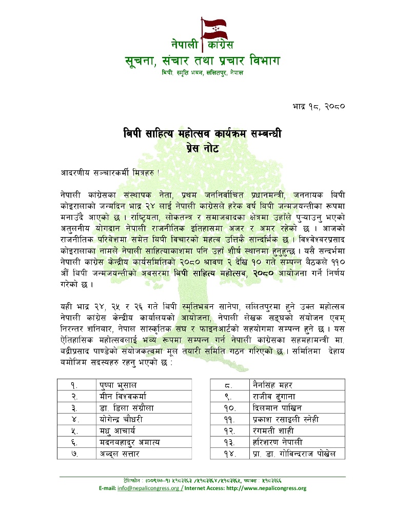 काठमाडौँ– नेपाली कांग्रेसले भदौ २४ देखि २६ गतेसम्म बीपी साहित्य महोत्सव आयोजना गर्ने भएको छ।