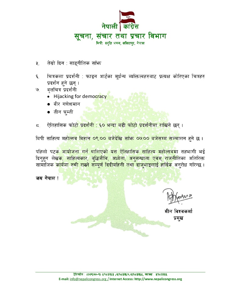महोत्सवमा ६० वटाभन्दा बढी ऐतिहासिक तस्वीर प्रदर्शनी गरिने कांग्रेस सूचना तथा सञ्चार विभागले जनाएको छ। केन्द्रीय कार्यालय सानेपामा हुने महोत्सवमा विभिन्न १२ वटा सत्रमा छलफल हुनेछ।