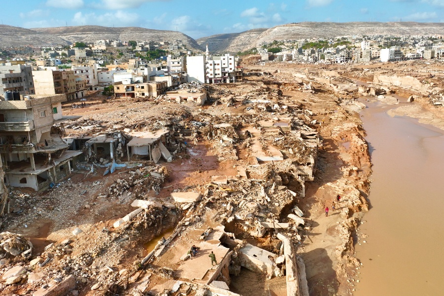 भूमध्यसागरीय शहरमाथि रहेको ड्याम बिस्फोट भएपछि आएको आँधीले शहर नष्ट भएको हो। शहरभित्र सुतिरहेका मानिसहरूसहित बहुतले भवनहरू ध्वस्त भएका छन्। लिबियाका आन्तरिक मन्त्रालयका प्रवक्ता लेफ्टिनेन्ट तारेक अल–खरराजले बुधबार एएफपी समाचार एजेन्सीलाई दिएको जानकारीअनुसार भूमध्यसागरीय शहरमा अहिलेसम्म ३ हजार ८४० जनाको मृत्यु भइसकेको छ। जसमा ३ हजार १९० जना पुरिएका छन्। तिनीहरूमध्ये कम्तीमा ४०० विदेशीहरू थिए। उनीहरू प्रायः सुडान र इजिप्टका नागरिक थिए।
