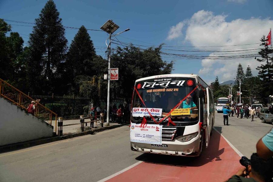 काठमाडौँ– सरकारले काठमाडौँको रत्नपार्कदेखि भक्तपुरको सूर्यविनायकसम्म द्रुत बस सेवा शुरू गरेको छ।
