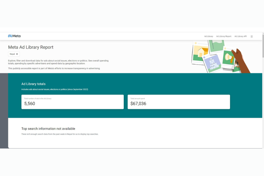 सामाजिक सञ्जाल फेसबुक सञ्चालन गरिरहेको मेटाले सार्वजनिक गरेको ‘मेटा एड लाइब्रेरी रिपोर्ट’ अनुसार गत सेप्टेम्बरदेखि नोभेम्बर ११ (सोमबार दिउँसो १२ बजेसम्ममा) पाँच हजार पाँच सय ६० फेसबुक पेज र प्रोफाइलबाट चुनावी विज्ञापन ‘बुस्ट’ गरिएको छ। यो सङ्ख्या निर्वाचन र राजनीतिक क्षेत्रसँग जोडिएका विषयबारे मात्रै गरिएको सशुल्क विज्ञापनको हो। आज दिउँसोसम्ममा कूल ६७ हजार ३६ अमेरिकी डलर बराबर खर्च भइसकेको मेटाको विवरणमा देखिन्छ।