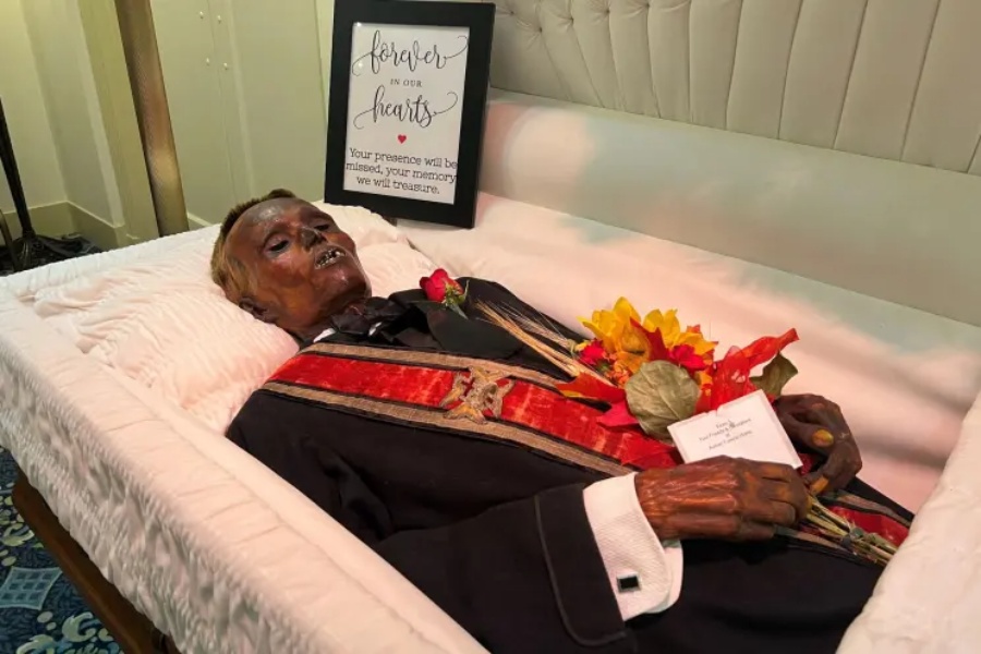 शवदाह गृहले उनीमाथि नयाँ प्रयाेग गर्याे। विभिन्न रसायनको प्रयोग गरेर उनको शरीरलाई सुकाइयाे। अर्थात् ‘ममिफाइड’ गरियाे। त्यसपछि उनलाई टक्सिडो, पाइन्ट लगाएर सजाएर राखियाे। लामो समयसम्म उनी यस्तै अवस्थामा रहे।