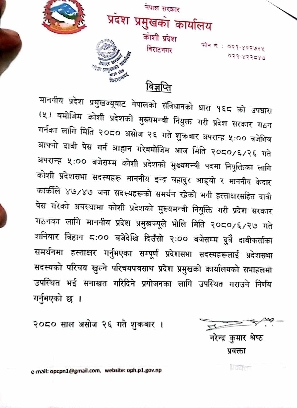 प्रदेश प्रमुखको कार्यालयका प्रवक्ता नरेन्द्रकुमार श्रेष्ठले विज्ञप्ति निकाल्दै शनिबार बिहान ८ बजेदेखि २ बजेसम्म मुख्यमन्त्रीका दुवै दाबीकर्ताको समर्थनमा हस्ताक्षर गर्ने सबै सांसदलाई प्रदेश प्रमुखको कार्यालयमा उपस्थित हुन भनिएको जानकारी दिएका हुन्।