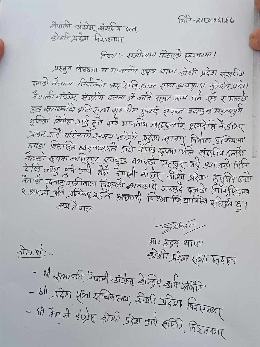 “कोशी प्रदेश सरकार निर्माण प्रक्रियामा भएका विकसित घटनाक्रमले गर्दा नैतिक रूपमा मैले संसदीय दलको नेताको रूपमा बसिरहन उपयुक्त नभएको महसुस गरी कांग्रेस कोशी प्रदेश संसदीय दलको नेताको पदबाट राजीनामा दिइएको छु, उनले राजीनामा पत्रमा भनेका छन्, “दलको नीति, सिद्धान्त र आदर्शप्रति प्रतिबद्ध रहँदै क्रियाशील रहनेछु।”