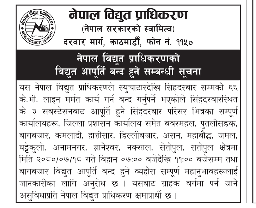 काठमाडौँ– सिंहदरबार र त्यस वरपरका क्षेत्रमा शनिबार चार घण्टा विद्युत् आपूर्ति बन्द हुने भएको छ।