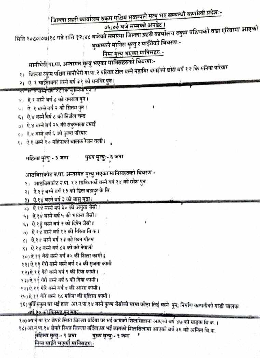 काठमाडौँ– रुकुम पश्चिममा भूकम्पमा परी मृत्यु भएका ३६ मध्ये २७ जनाको सनाखत भएको छ।
