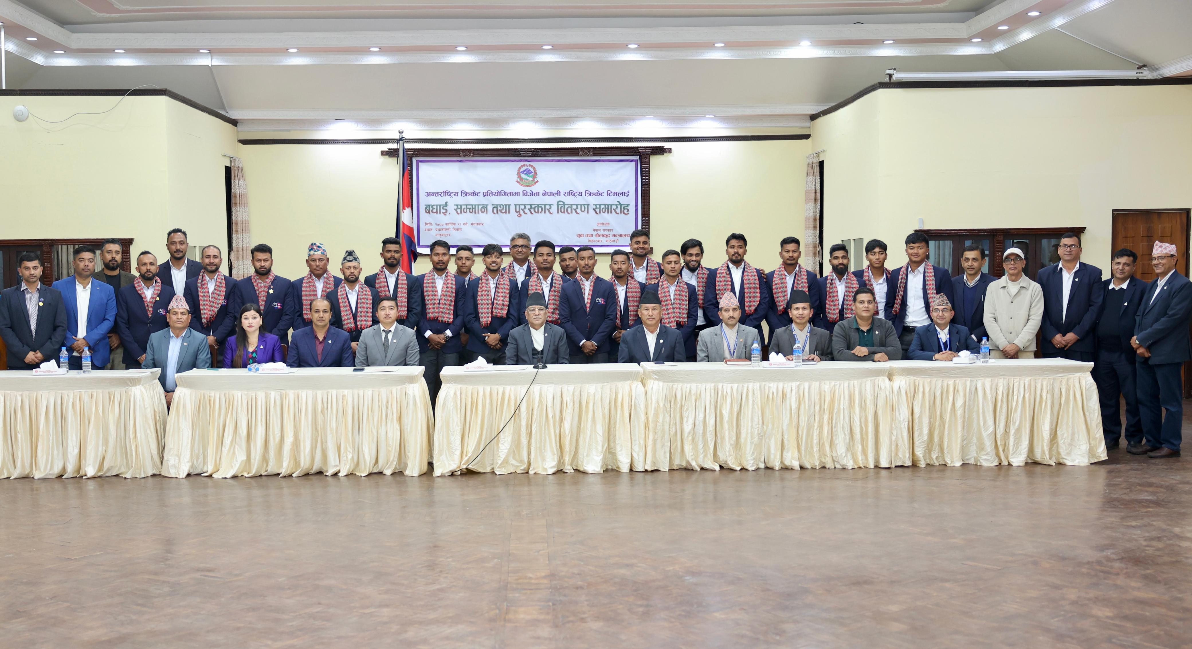 कार्यक्रममा प्रधानमन्त्री दाहालले उत्कृष्ट प्रदर्शनका साथै नेपालको प्रतिष्ठालाई अन्तर्राष्ट्रियस्तरमा स्थापित गर्न महत्त्वपूर्ण भूमिका खेलेको क्रिकेट खेलाडीको प्रशंसा गर्दै बधाई दिए। उनले विश्वकपका लागि पनि राम्रो मिहिनेत गर्ने खेलाडीहरूलाई आग्रह गरे। “१० वर्षपछि नेपाल टी२० मा छनोट भएको छ, विश्वकपमा पनि राम्रो मिहिनेत गर्नुहोला। कतिपय बेला जीत र हार संयोगको कुरा पनि हुन्छ। तपाईंहरूले राम्रो गर्नुहोला,” उनले भने।