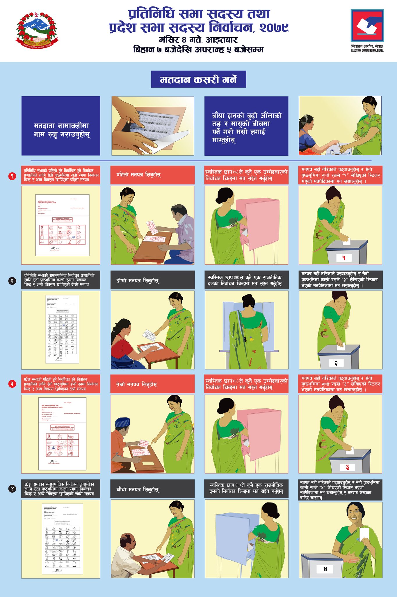 प्रतिनिधिसभा सदस्यको प्रत्यक्षतर्फ, प्रतिनिधिसभाकाे समानुपातिकतर्फ, प्रदेशसभा सदस्यको प्रत्यक्षतर्फ र प्रदेशसभाको समानुपातिकतर्फका १/१ गरी चारवटा छुट्टाछुट्टै मतपत्र पेटिकामा खसाल्नु पर्छ।