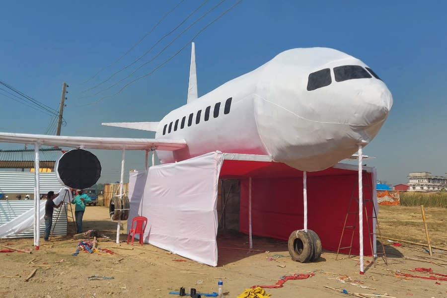 छैटौँ लुम्बिनी प्रादेशिक महोत्सवको प्रवेशद्वारमा करिब पाँच लाख रुपैयाँको लागतमा भारतबाट कालिगड बोलाएर विमानको आकृति तयार हुँदैछ।