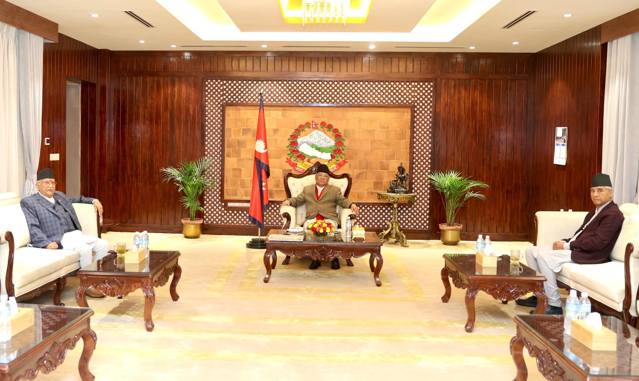 काठमाडौँ– प्रधानमन्त्रीको सरकारी निवास बालुवाटारमा तीन दलका शीर्ष नेताबीच भेटवार्ता भएको छ।