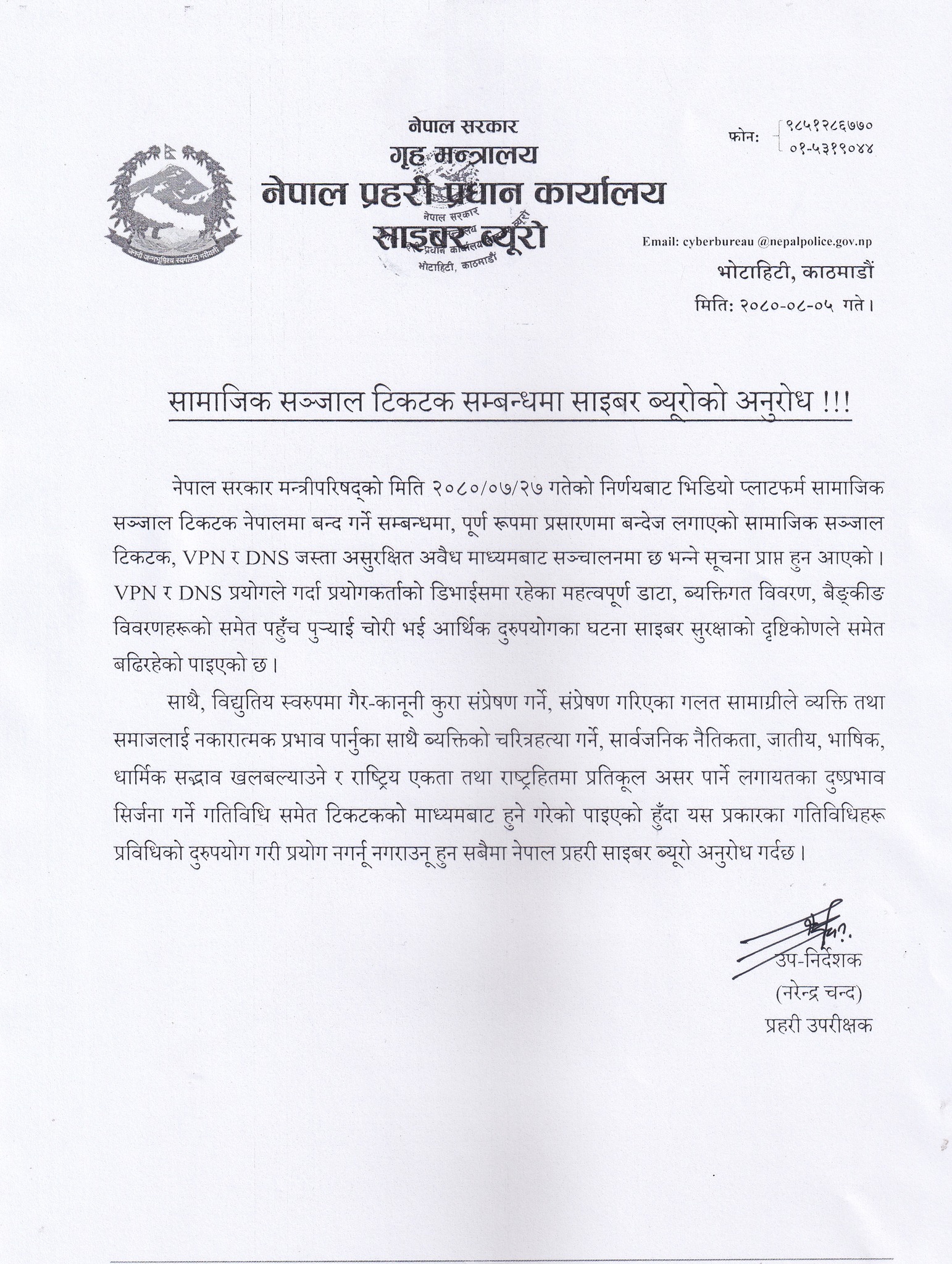 मन्त्रिपरिषद्को कात्तिक २७ गतेको बैठकले सामाजिक सञ्जाल टिकटक प्रसारणमा पूर्ण रूपमा बन्देज लगाएको थियो। तर, अझै भीपीएन, डीएनएसजस्ता असुरक्षित र अवैध माध्यमबाट सञ्चालन भइरहेको भन्ने सूचना प्राप्त भएको साइबर ब्युरोका एसपी नरेन्द्र चन्दले बताए।