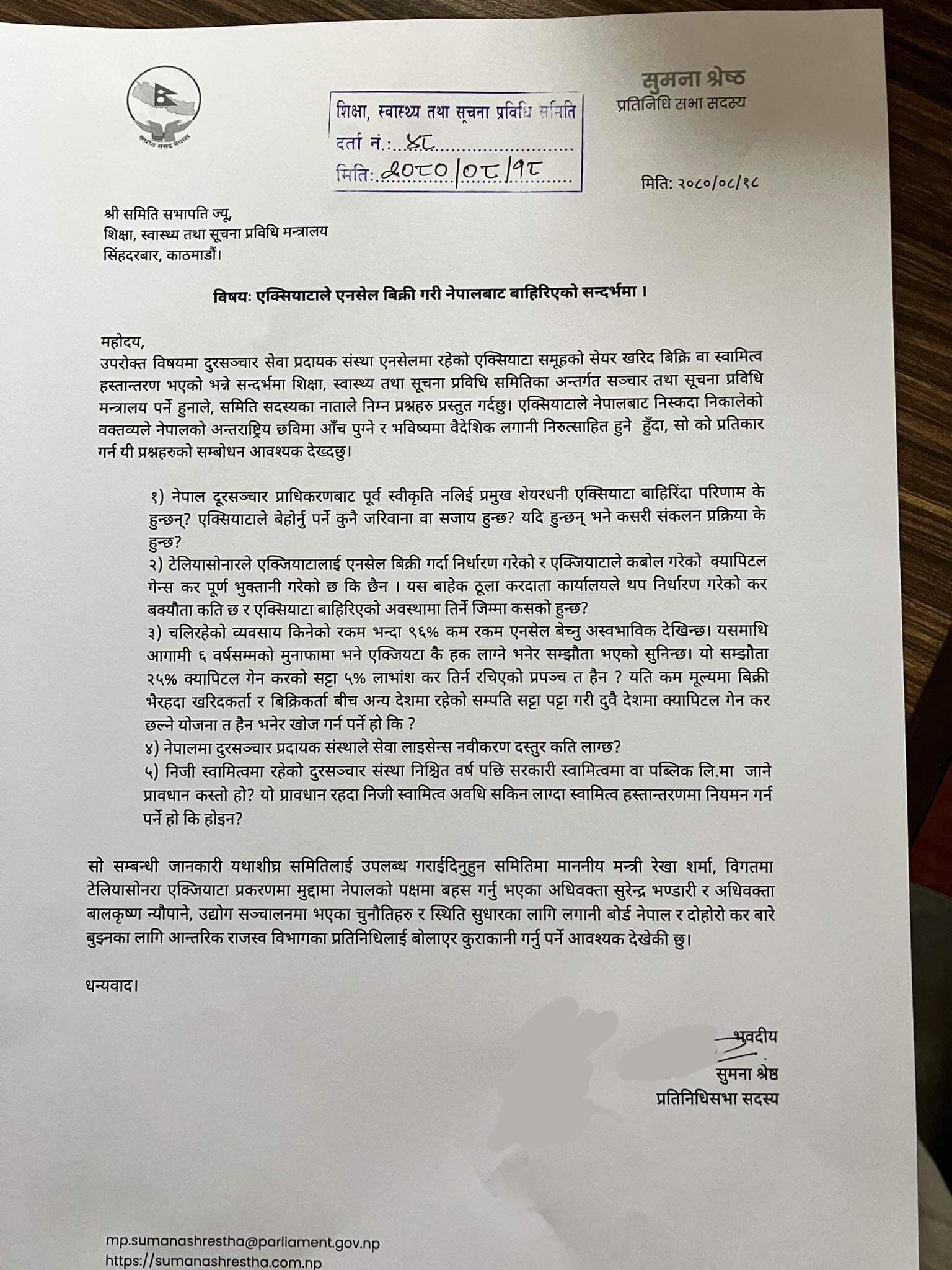 “चलिरहेको व्यवसाय किनेको रकमभन्दा ९६ प्रतिशत कम रकम एनसेल बेच्नु अस्वाभाविक देखिन्छ। यसमाथि आगामी ६ वर्षसम्मको मुनाफामा भने आजिआटा कै हक लाग्ने भनेर सम्झौता भएको सुनिन्छ। यो सम्झौता २५ प्रतिशत क्यापिटल गेन करको सट्टा ५ प्रतिशत लाभांश कर तिर्न रचिएको प्रपञ्च त हैन? यति कम मूल्यमा बिक्री भइरहँदा खरिद कर्ता र बिक्रीकर्ताबिच अन्य देशमा रहेको सम्पत्ति सट्टापट्टा गरी दुवै देशमा क्यापिटल गेन कर छल्ने योजना त हैन भनेर खोज गर्नुपर्ने हो कि?” पत्रमा भनिएको छ।