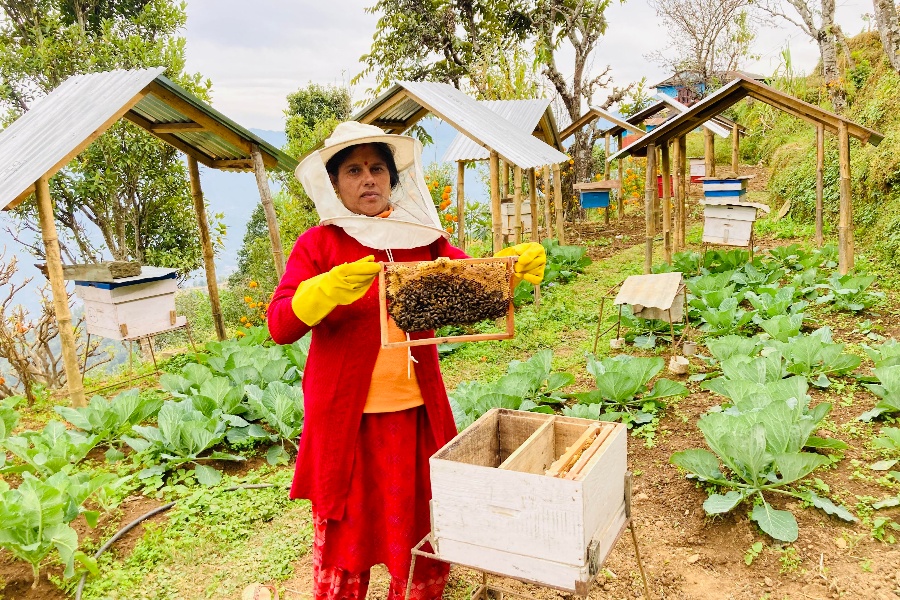 गलकोट– बागलुङ नगरपालिका–१२ अमलाचौरस्थित चोलादेवी पाठक आफ्नो घरमुनिको बारीमा मौरीको स्याहारमा छिन्।