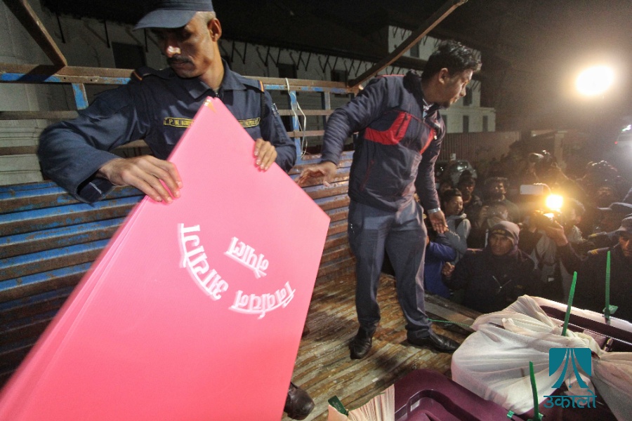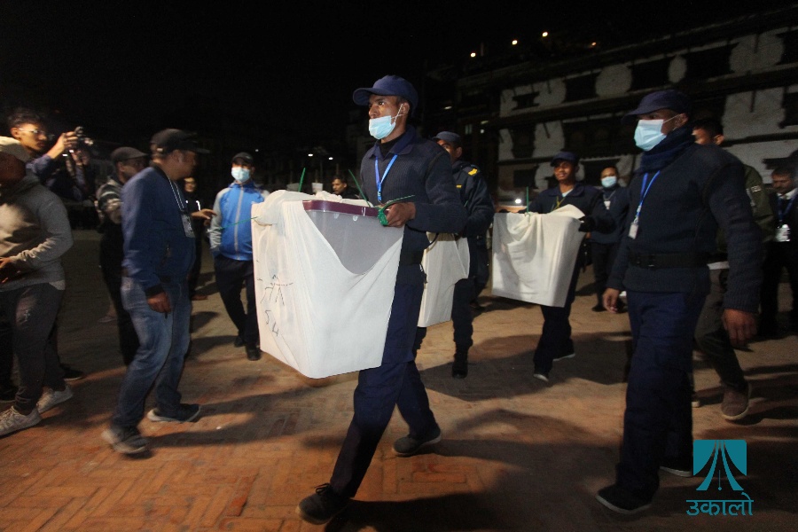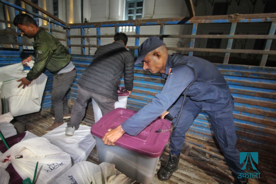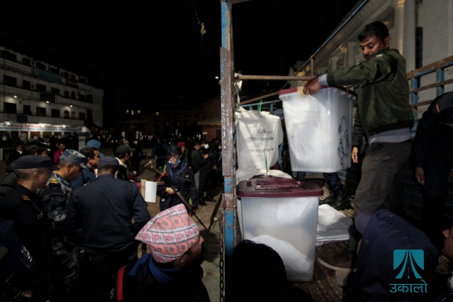 मतदानको निर्धारित समय सकिएसँगै मतपेटिका मतगणना स्थलमा ओसार्न थालिएको छ। काठमाडौं- ८ को १ अन्तर्गत वसन्तपुर नव आदर्श माध्यामिक विद्यालयमा मतदान स्थलका मतपेटिका संकलन गरेर मतदान स्थलमा लैजान थलिएको छ। वसन्तपुर नव आदर्श माध्यामिक विद्यालयमा ५ वटा मतदान केन्द्र रहेका थिए। तस्वीरहरू : अमित मचामसी